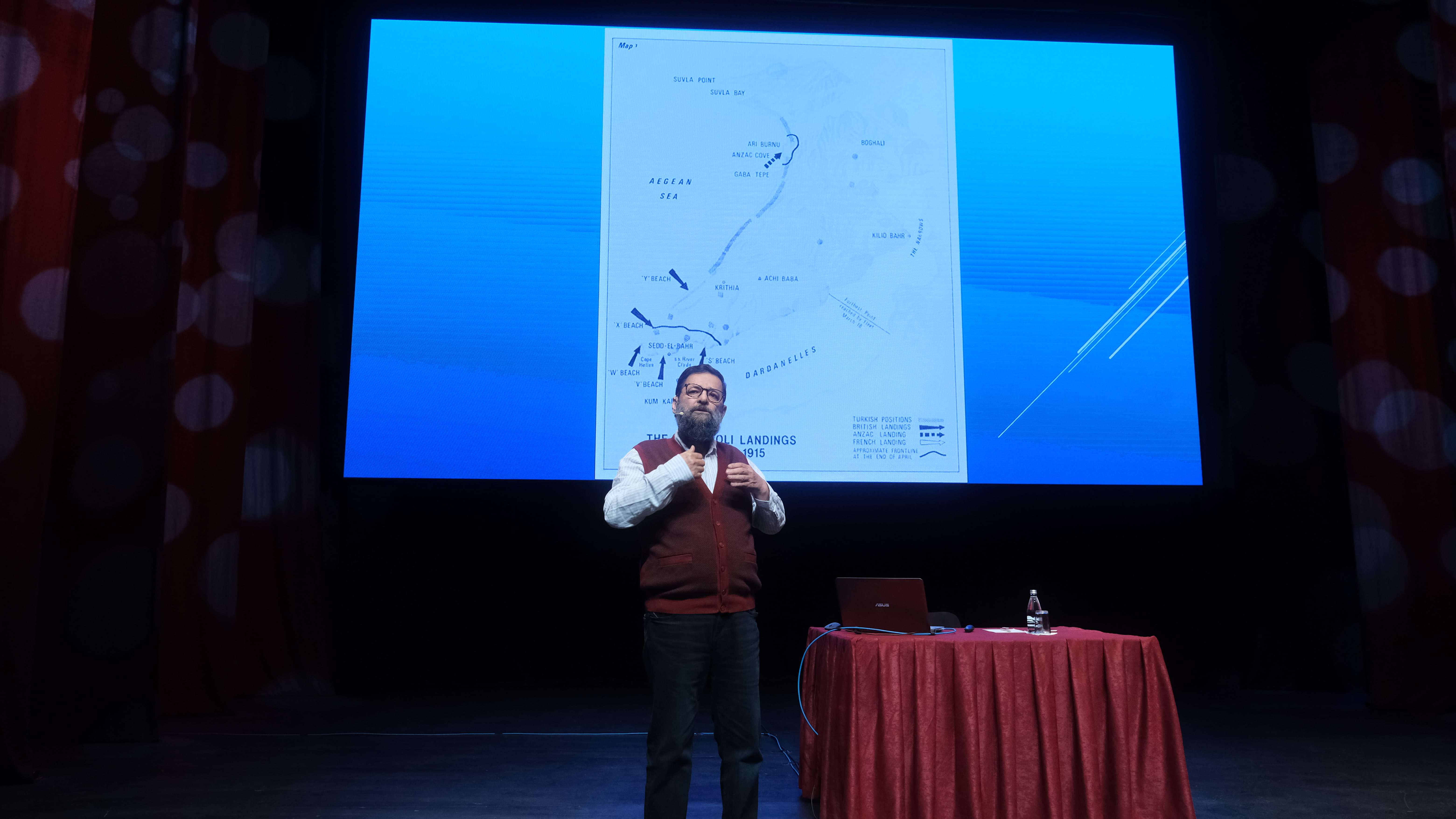 Prof. Dr. Haluk Oral, Osmanlı Devleti’nin 1. Dünya Savaşı’na girmesinden başlayarak adım adım Çanakkale Savaşları’nın başlangıcından zaferin kazanılmasına kadar tüm süreci farklı belgeler, haritalar, kalıntılar ve çeşitli görsellerle anlattı. Programda, savaşa bugünden bakıldığında dikkati çekmeyen kimi ayrıntıları da belirten Oral, savaşın henüz başında Osmanlının bölgeye asker sevkiyatında yaşadığı sıkıntıyı şu sözlerle dile getirdi: “Şimdi, en büyük problem asker sevkiyatıydı tabii ki. Bugün eğer arabaya atlayıp yola çıkarsanız üç dört saatte Çanakkale’ye varabiliyorsunuz ama o zaman tabii ki böyle yoldan gitme imkânı yoktu. Denizden gittiğinizde bu iki gün sürüyordu. Demiryollarıyla gitmeye çalışırsanız demiryolu Uzunköprü’ye kadar gidiyordu. Uzunköprü de, Gelibolu Yarımadası’nda Bolayır var ya en dar yerinde, Bolayır’a 100 kilometre uzaktaydı.”