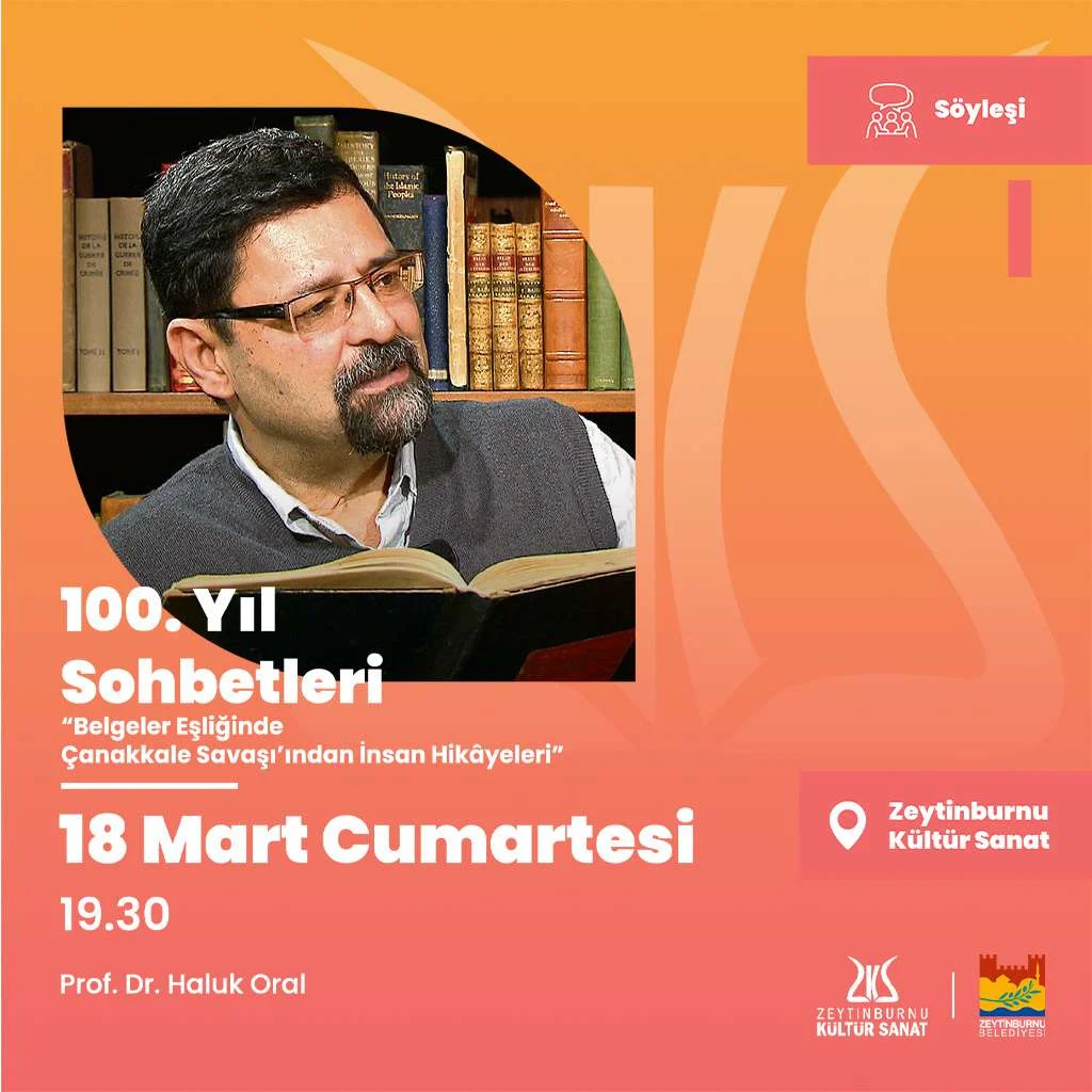 Zeytinburnu Kültür Sanat’ta 100. Yıl Sohbetleri’nin dördüncü programında Çanakkale Zaferi’nin yıl dönümü münasebetiyle “Belgeler Eşliğinde Çanakkale Savaşı’ndan İnsan Hikâyeleri” başlıklı özel bir seminer gerçekleştirildi. Prof. Dr. Haluk Oral’ın sunduğu program 18 Mart akşamı saat 19.30’da başladı.
