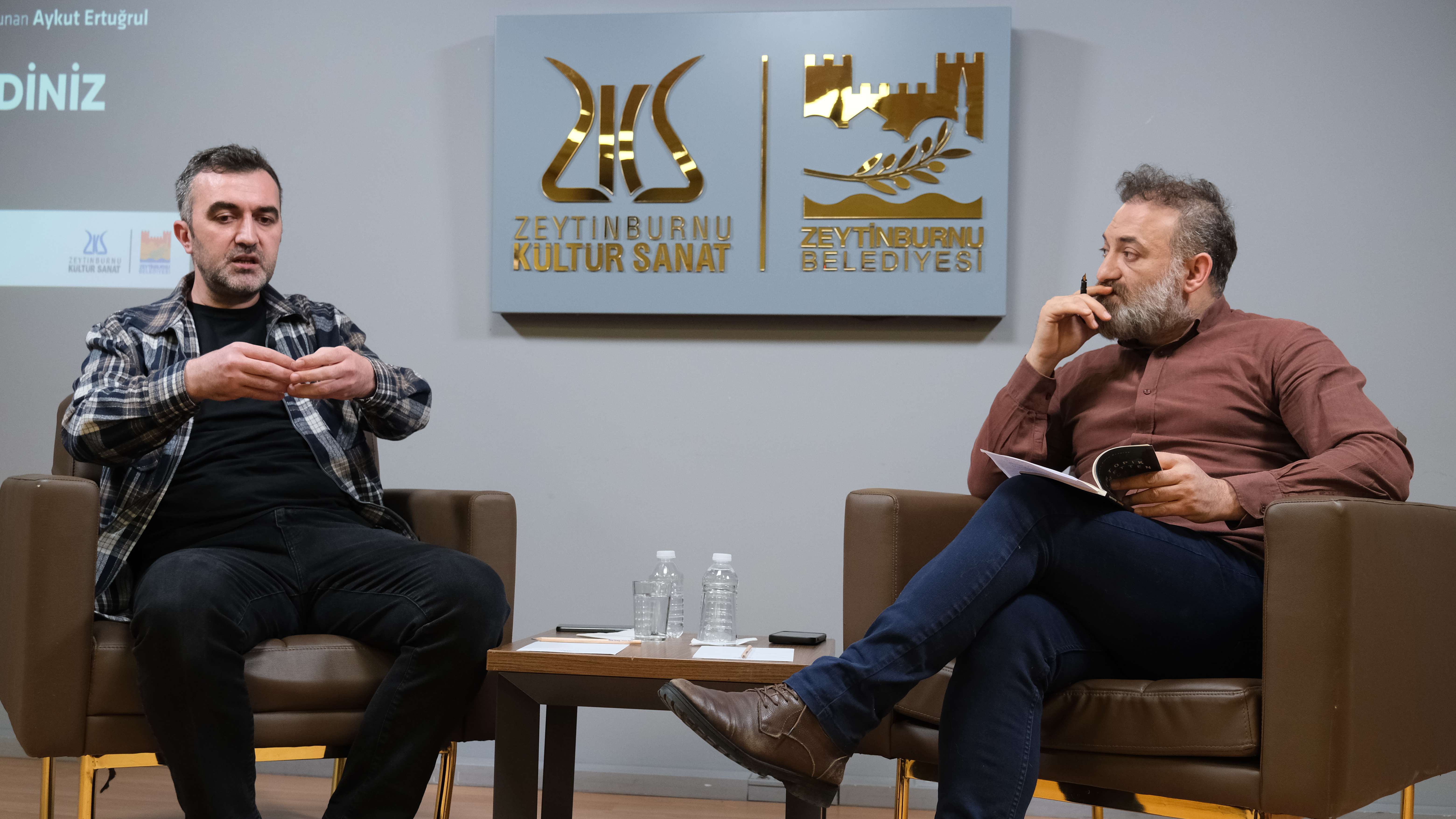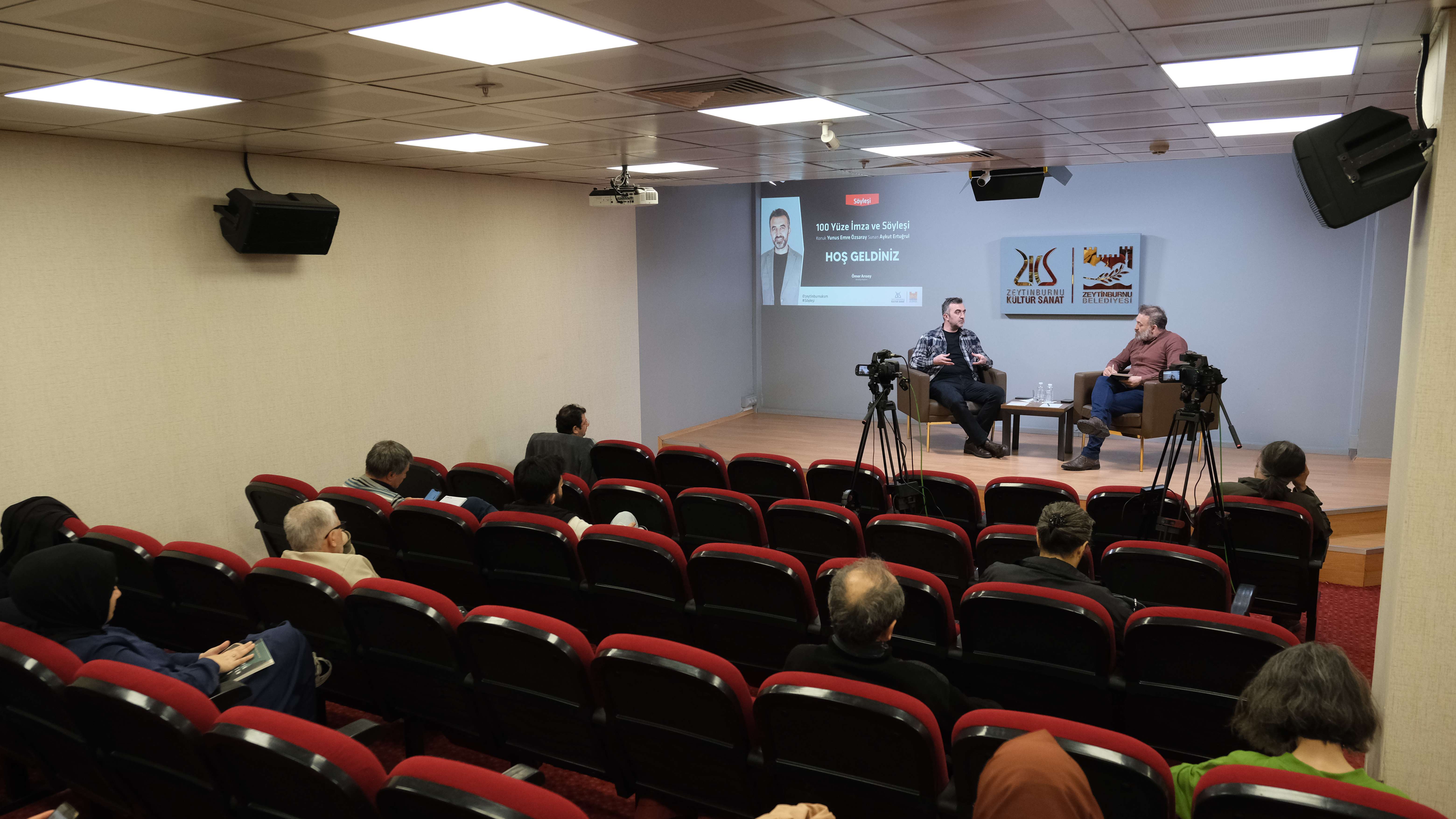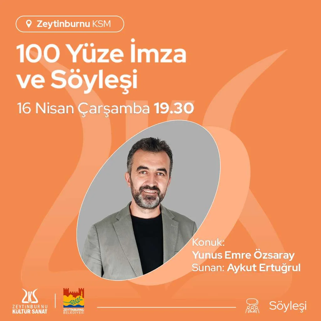 Zeytinburnu Kültür Sanat’ta, 100 Yüze İmza ve Söyleşi programının nisan ayı söyleşisi gerçekleşti. Aykut Ertuğrul’un sunumuyla, 16 Nisan Çarşamba akşamı saat 19.30’da başlayan söyleşinin konuğu yazar Yunus Emre Özsaray oldu. “Distopik Cinnetten Kaçış” adlı yeni öykü kitabından yola çıkılarak Yunus Emre Özsaray’ın edebiyat anlayışı ele alındı.