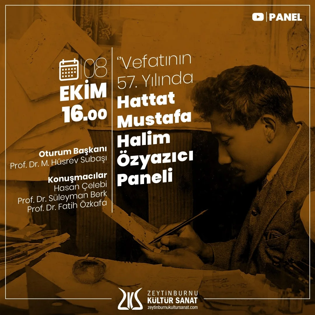 Zeytinburnu Kültür Sanat, 20. Yüzyılın Büyük Türk Hattatı Mustafa Halim Özyazıcı’yı vefatının 57. yılında hem panel hem de sergi ile anıyor. 8 Ekim Cuma günü saat 16.00’da başlayacak panel ZKS’de, yine aynı tarihte saat 18.30’da açılacak sergi Kazlıçeşme Sanat’ta sanatseverlerle buluşacak.