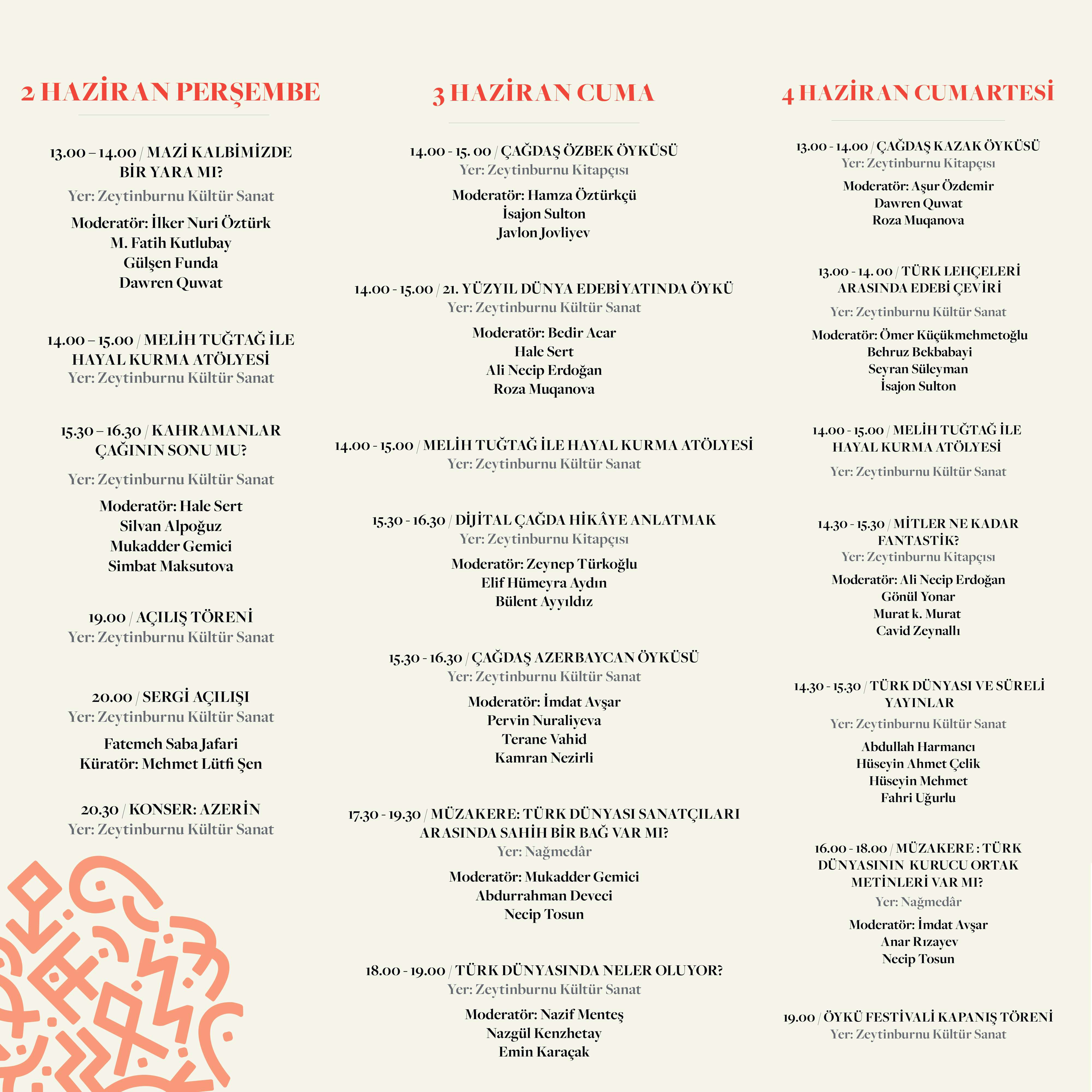 Azerbaycan’ın odak ülke olarak yer aldığı etkinliklere, Azerbaycan edebiyatının en önemli kalemlerinden Anar Rızayev de katkıda bulunuyor. Azerbaycan, Özbekistan, Kazakistan ve Türk dünyasının farklı bölgelerinden gelecek öykücü ve çevirmenler ile metinler üzerinden kardeşlik bağlarının güçlendirilmesi ve anlatılardaki akrabalıkların altının çizilmesi hedefleniyor. Öykü türünün edebiyatımızdaki önemli temsilcilerinden Necip Tosun ve Abdullah Harmancı’nın da yer aldığı toplam 39 katılımcı ile gerçekleşecek oturumlara, Zeytinburnu Kültür Sanat, Zeytinburnu Kitapçısı ve Nağmedâr ev sahipliği yapıyor.
