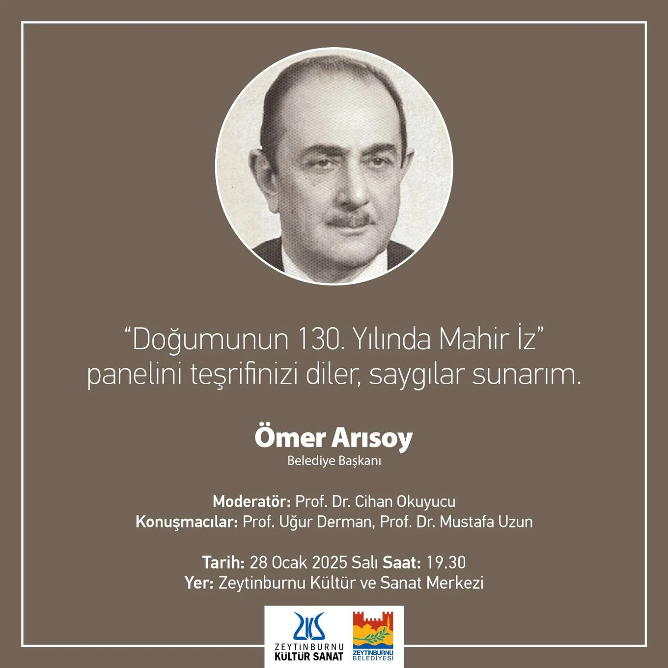 Zeytinburnu Kültür Sanat’ta her ay düzenlenen panellerle kültür dünyamızın önemli isimleri hatırlanmaya devam ediyor. Mahir İz, doğumunun 130. yılında bir eğitimci ve kültür insanı olarak değerlendirilecek. 28 Ocak Salı akşamı saat 19.30’da başlayacak panelin moderatörlüğünü Prof. Dr. Cihan Okuyucu üstlenirken Prof. Uğur Derman ve Prof. Dr. Mustafa Uzun konuşmalarıyla katkıda bulunacak.