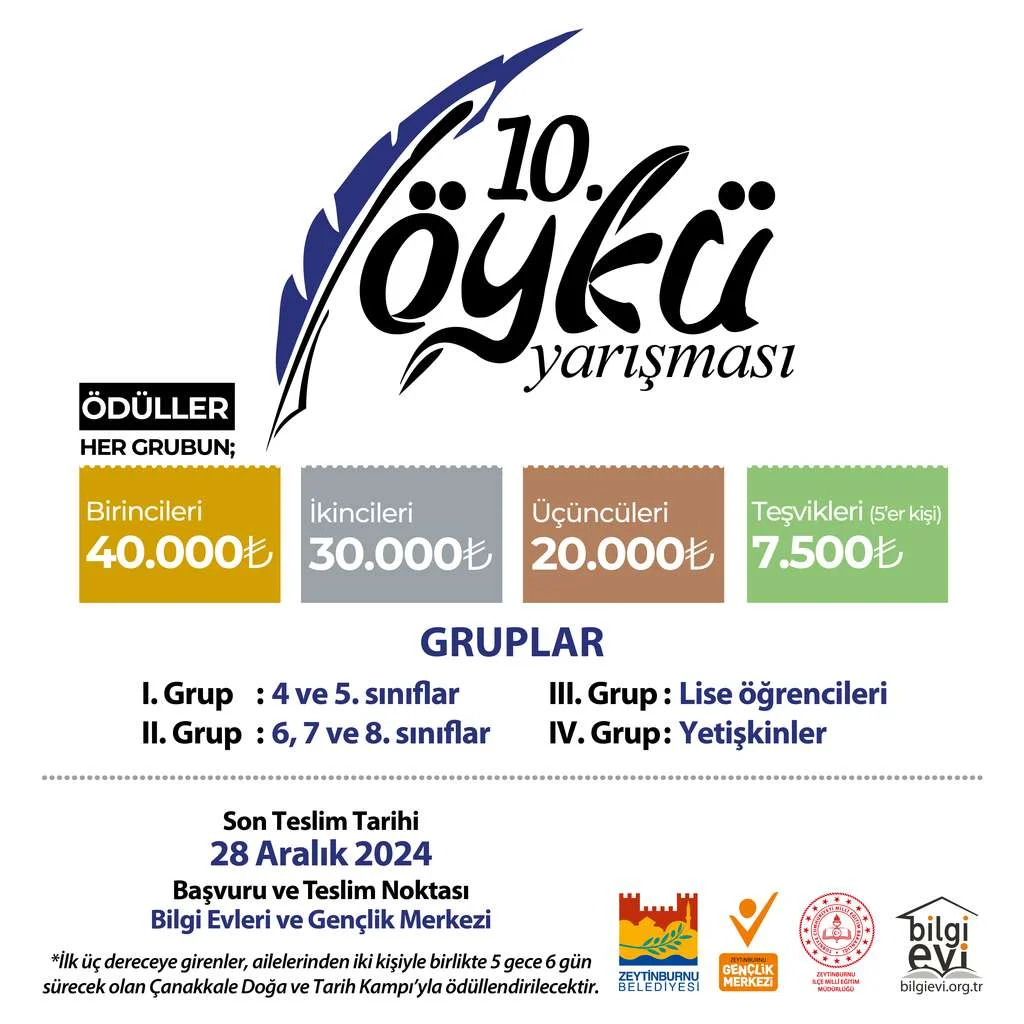 Zeytinburnu Bilgi Evleri ve Gençlik Merkezinin gelenekselleşen etkinliklerinden ‘10. Öykü Yarışması’ için başvurular başladı. Dilin doğru ve etkin bir biçimde kullanılmasını teşvik etmenin yanı sıra öykücülüğümüze yeni eserler kazandırmanın da amaçlandığı yarışmanın finalinde Zeytinburnu Belediyesi tarafından kazananlara; toplam 510 bin TL para ödülü dağıtılacak.