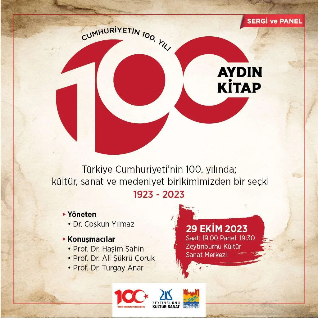 Cumhuriyetimizin 100. yılında; kültür, sanat, medeniyet birikimimizden bir seçki sunan “100 Aydın 100 Kitap” sergisi 29 Ekim Pazar akşamı saat 19.00’da açıldı. Sergi açılışının hemen akabinde yine aynı başlıkla, Cumhuriyetimizin 100 yıllık birikiminin konuşulduğu “100 Aydın 100 Kitap” paneli yapıldı. Moderatörlüğünü Prof. Dr. Turgay Anar’ın yaptığı panelin konuşmacıları ise Prof. Dr. Haşim Şahin ve Prof. Dr. Ali Şükrü Çoruk oldu.