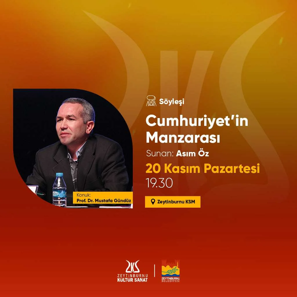 Zeytinburnu Kültür Sanat’ta bu sezon birbirinden kıymetli konuklarla Cumhuriyetimizin 100 yılının konuşulduğu Cumhuriyet’in Manzarası programının ikinci konuğu Prof. Dr. Mustafa Gündüz oldu. Asım Öz’ün sunduğu program 20 Kasım akşamı saat 19.30’da başladı.