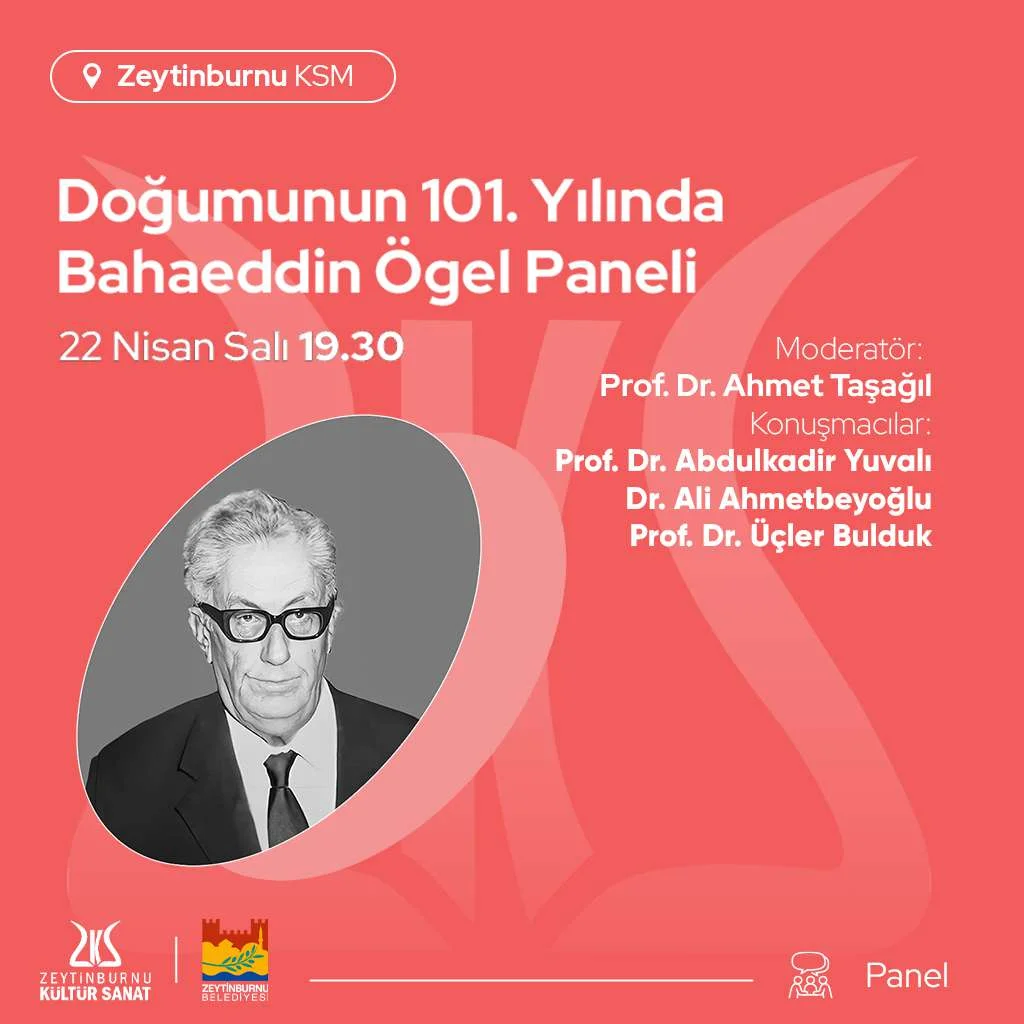 Zeytinburnu Kültür Sanat’ta bu ayın paneli, 22 Nisan Salı akşamı saat 19.30’da gerçekleşecek. Bahaeddin Ögel’in hayatının, eserlerinin ve Türk kültür tarihine yaptığı katkıların değerlendirileceği panelin moderatörlüğünü Prof. Dr. Ahmet Taşağıl üstlenirken Prof. Dr. Abdulkadir Yuvalı, Dr. Ali Ahmetbeyoğlu ve Prof. Dr. Üçler Bulduk konuşmacı olarak panelde yer alacak.