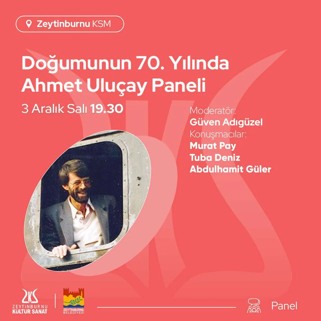 Zeytinburnu Kültür Sanat’ta Türk sinemasının çok erken dönemde yitirdiği bilge yönetmeni Ahmet Uluçay’ın odağa alındığı bir panel gerçekleşti. 3 Aralık Salı akşamı saat 19.30’da başlayan panelde Ahmet Uluçay’ın hem sineması hem de sanatına yansıttığı özgün bakışı ele alındı. Moderatörlüğü Güven Adıgüzel üstlenirken Murat Pay, Tuba Deniz ve Abdulhamit Güler konuşmacı olarak panele katkıda bulundu.