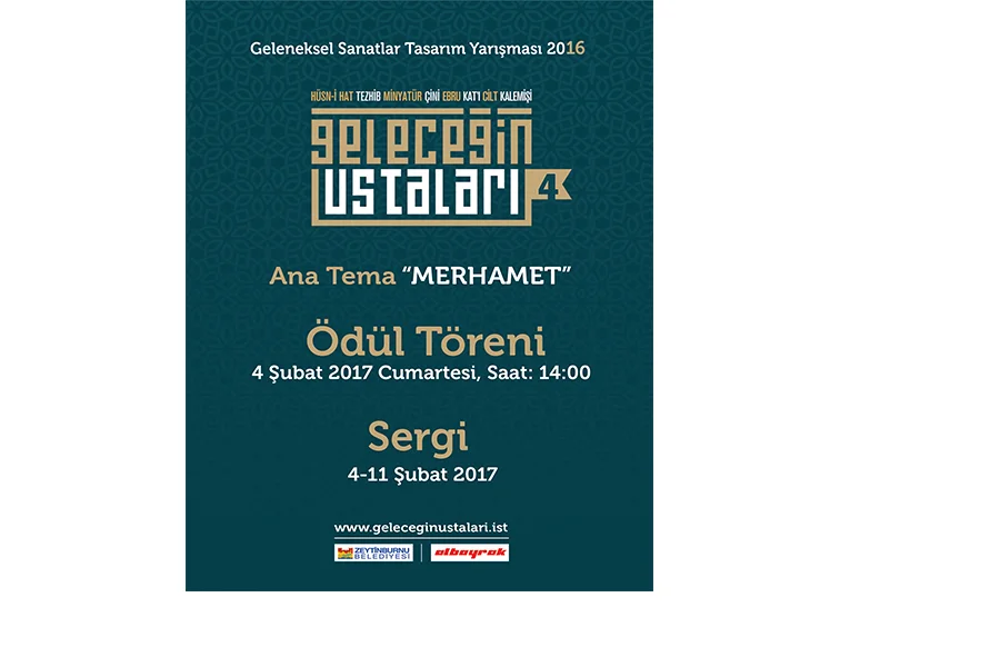 Zeytinburnu Kültür Sanat Merkezinde 4 Şubat 2017 Cumartesi günü saat: 14.00’te gerçekleştirilecek törende hüsn-i hat, tezhip, minyatür, ebru, çini, cilt, kat’ı, kalem işi dallarında dereceye giren eser sahiplerine ödülleri verilecek. Tören öncesi ödül alacak olan ve sergilenmeye değer bulunan eserlerden oluşan bir sergi açılacak.