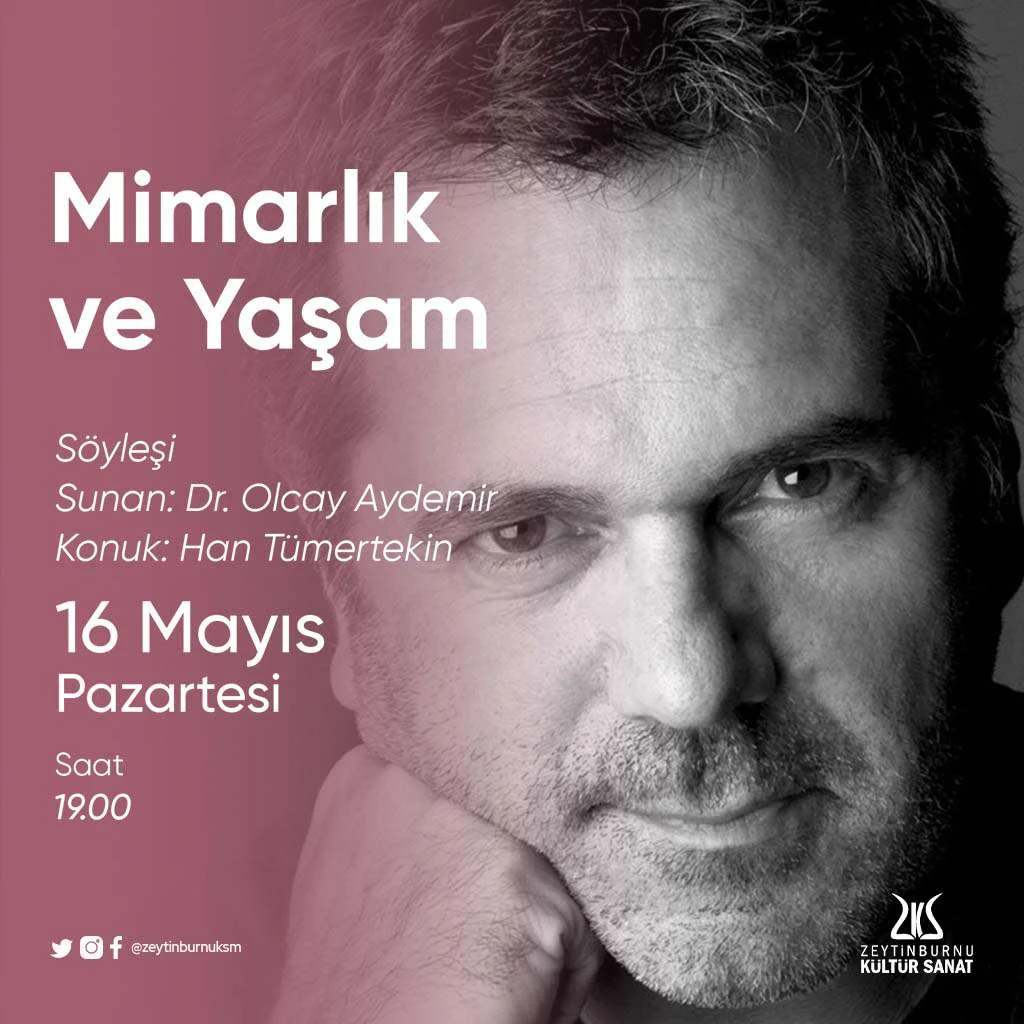 Dr. Olcay Aydemir’in sunduğu “Mimarlık ve Yaşam” söyleşilerinin bu ayki konuğu mimar Han Tümertekin’di. 16 Mayıs’ta gerçekleşen programda Tümertekin’in dahil olduğu projedeki tasarımlar üzerine bir sohbet gerçekleşti.