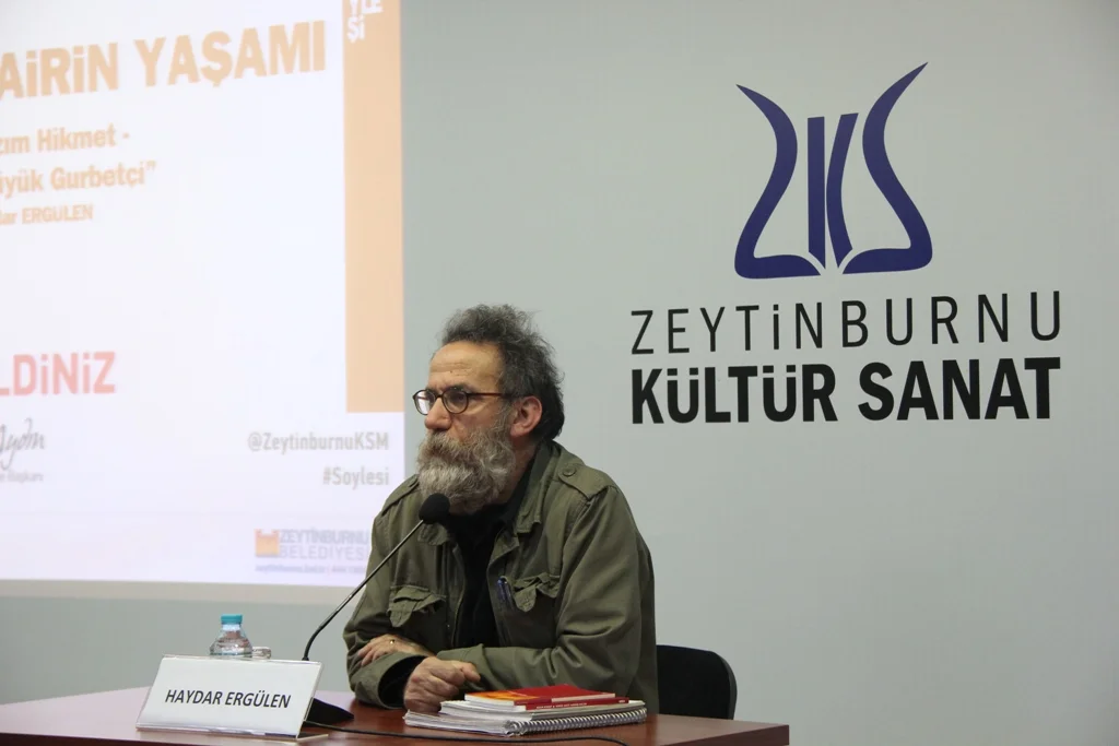 Şair Haydar Ergülen Zeytinburnu Kültür ve Sanat Merkezi’nde gerçekleşen Şairin Yaşamı söyleşi dizisinde 27 Ocak Salı günü gerçekleşen bölümünde şair Nazım Hikmet’i anlattı. Nazım Hikmet’in uzun yıllar yasaklı kalmasına neden olan siyasi düşüncesine ve komünist parti ile ilişkisine değinen Ergülen, şairlerin siyasi partilerle organik bağ kurmasının doğru olmadığı düşüncesini ifade etti. Nazım Hikmet’in doğumundan vefatına yaşamını özetleyen Haydar Ergülen şairin siyasi düşüncesine şu sözlerle değindi.