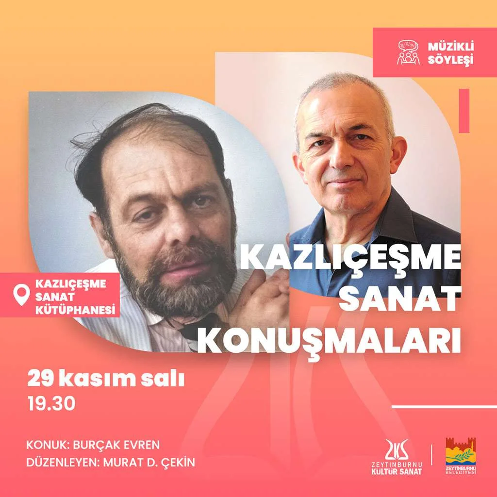 Kazlıçeşme Sanat Konuşmaları’nın kasım ayı konuğu Burçak Evren oldu. Kazlıçeşme Sanat’taki program, Murat D. Çekin’in sunumuyla gerçekleşti. Programa kemanda Ebru Söylemez ve piyanoda Feride Öget’in Türk müziği performansları eşlik etti.