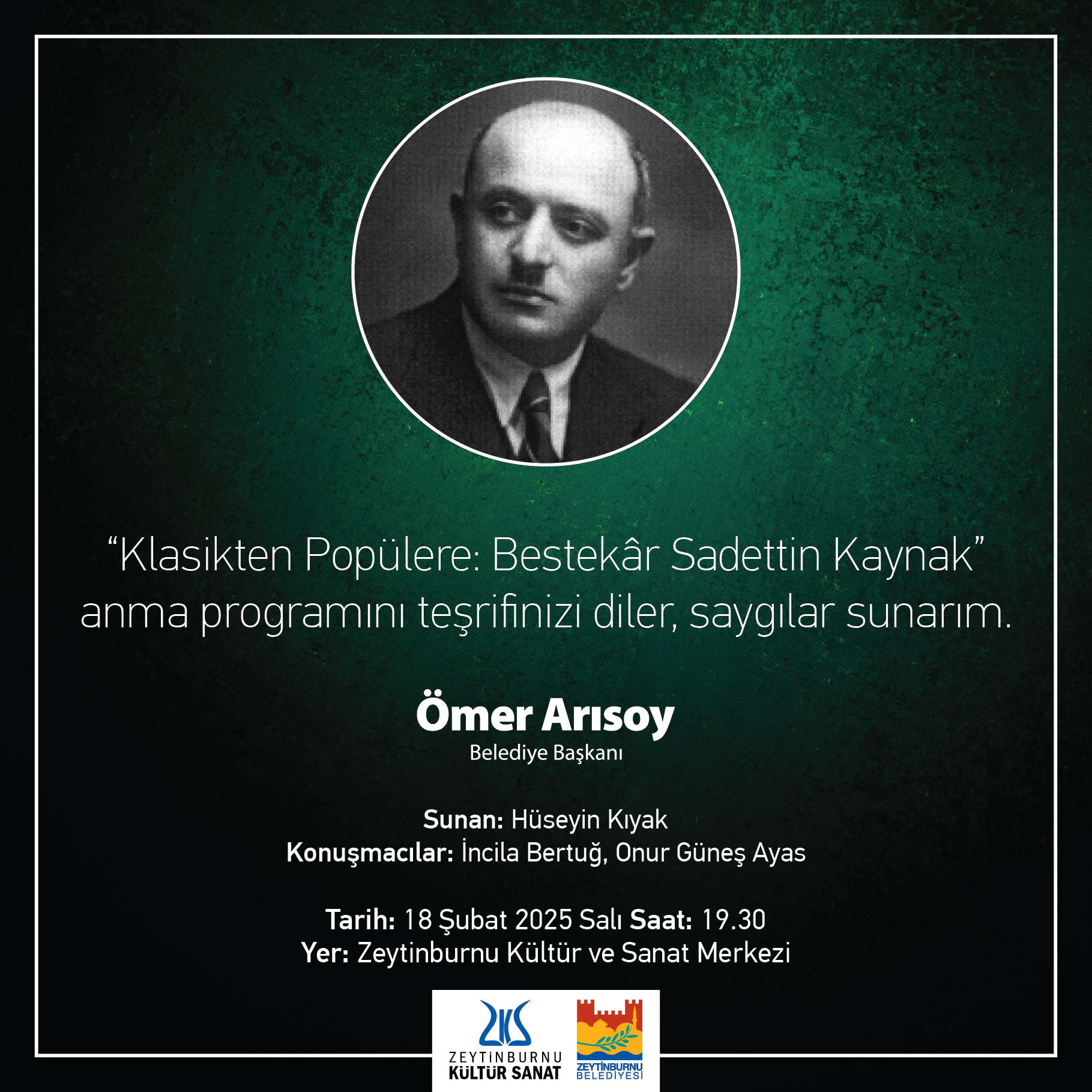 Zeytinburnu Kültür Sanat’ta her ay, kültür dünyamızın önemli isimleri hatırlanıyor. Ünlü Türk bestekârlarından Sadettin Kaynak, vefatının 64. yılında bir programla anılacak. 18 Şubat Salı akşamı saat 19.30’da başlayacak programın sunuculuğunu Hüseyin Kıyak üstlenirken İncila Bertuğ ve Onur Güneş Ayas konuşmacı olarak yer alacak. Programda Sadettin Kaynak’ın eserlerinin seslendirileceği bir dinleti de dinleyicilerle buluşacak.