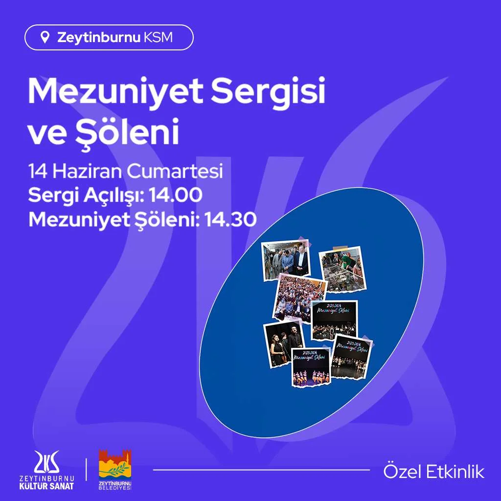Zeytinburnu Kültür Sanat’ta kurs sezonu, sergi açılışı ve şölenle tamamlandı. 14 Haziran Cumartesi günü saat 14.00’te açılan mezuniyet sergisinde ZKS kursiyerlerinin eserleri sanatseverlerle buluştu. Hemen ardından saat 14.30’da başlayan mezuniyet şöleniyle kursiyerlerin mezuniyet coşkusu paylaşıldı. Zeytinburnu Kültür Sanat 2024-2025 kurs sezonunu taçlandıran törene İstanbul Vali Yardımcısı Mustafa Asım Alkan, Zeytinburnu Kaymakamı Dr. Adem Uslu ve Zeytinburnu Belediye Başkanı Ömer Arısoy da katıldı.