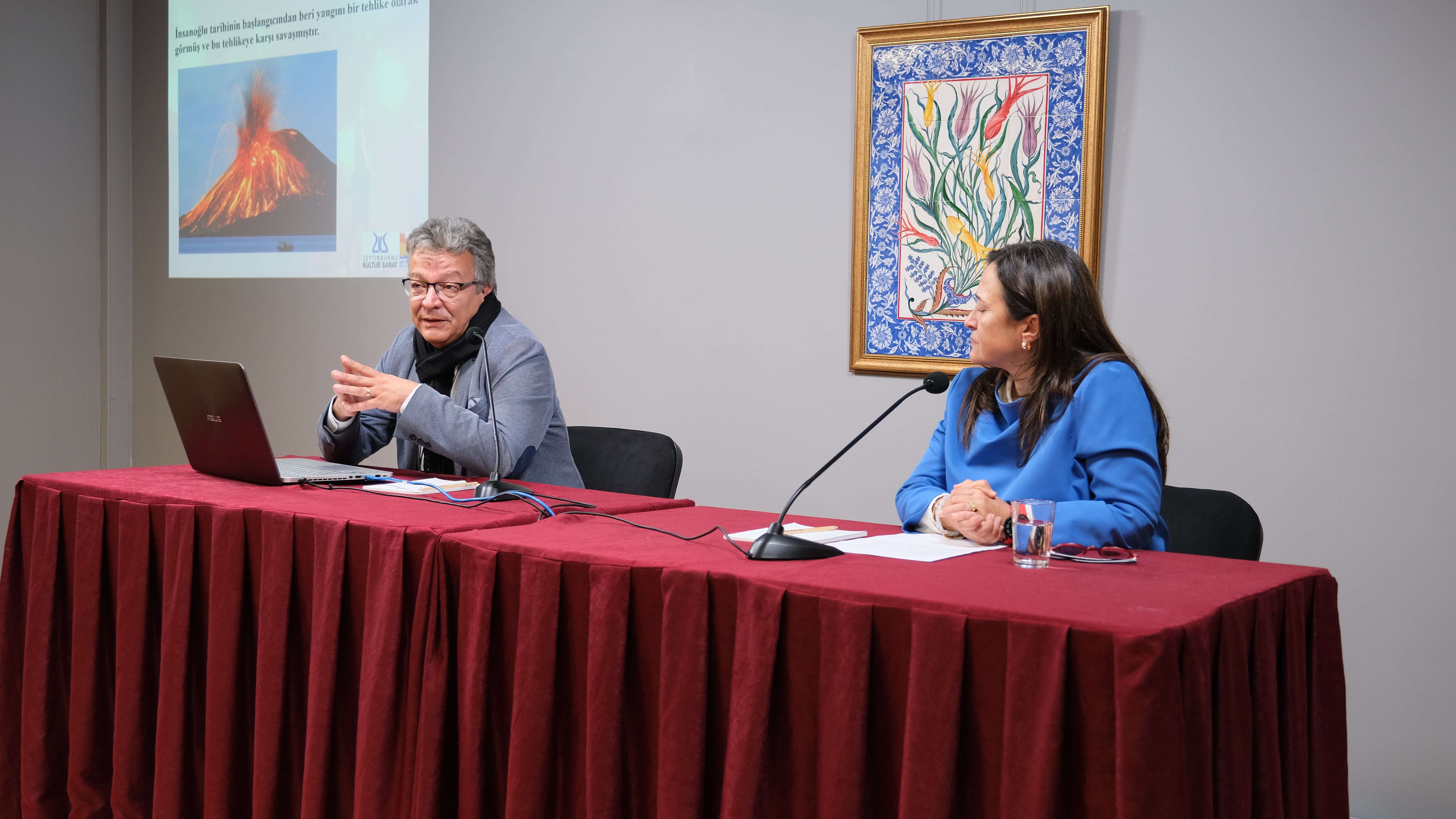 Mimari eserlerde doğal afet riskleri ve özellikle yangın riskleri üzerine yapılan söyleşi saat 19.30’da başladı. Dr. Olcay Aydemir’in moderatörlüğünde başlayan programda Prof. Dr. Mustafa Özgünler, “Yangın mimarları, mimarlar ise yaşamımızı çok etkiliyor. Yaşamımıza çok derinden dokunan bir meslek aslında. Bir mimarın yapması gereken, tasarımlarında sağlaması gereken birçok koşul var. Bunlardan birincisi konfor, diğeri estetik olması, fonksiyonellik, ekonomi ve güvenlik. Maalesef biz güvenlik kısmını her gün yaşamadığımız için bazen atlayabiliyoruz. Konfor ve estetik çok ilgimizi çekiyor. Konforumuza önem veriyoruz. Ama güvenlik kısmı dediğimiz işte doğal afetlere, bunların içinde deprem, su baskını ve yangın var, hazırlanmayı pek de sevmiyoruz. Ülke olarak ve insan olarak unutuyoruz bazı şeyleri. Ama maalesef, sizin de dediğiniz gibi her gün yangın tehdidi ile baş başayız.” sözleri ile mimari eserler için yangın riskine değindi.