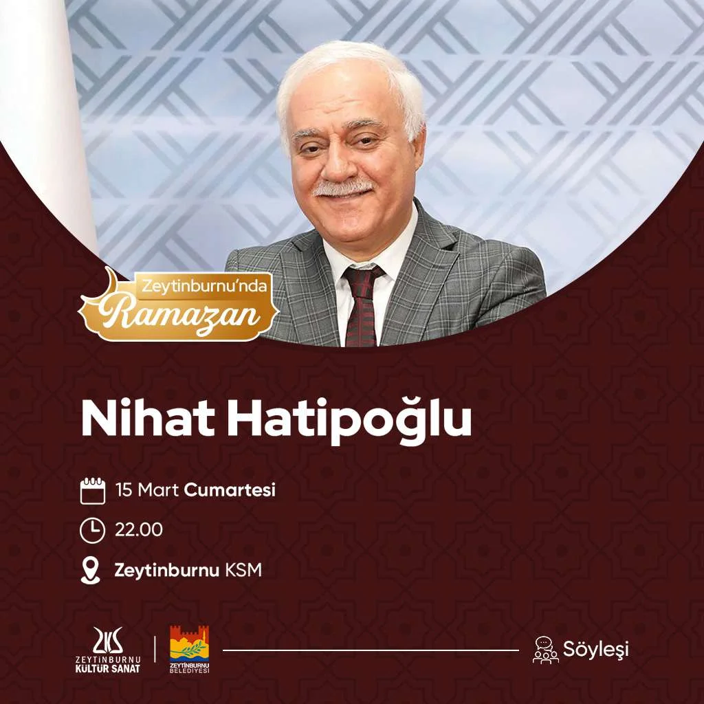 Nihat Hatipoğlu, Ramazan etkinlikleri kapsamında Zeytinburnu Kültür Sanat’ın konuğu oldu. 15 Mart Cumartesi akşamı saat 22.00’de gerçekleştirilen söyleşi öncesinde AK Parti İstanbul İl Başkanı Abdullah Özdemir ve Zeytinburnu Belediye Başkanı Ömer Arısoy bir selamlama konuşması yaptı. Zeytinburnu halkının yoğun ilgi gösterdiği program, Nihat Hatipoğlu’nun Ramazan iklimini yansıtan sohbetiyle devam etti.
