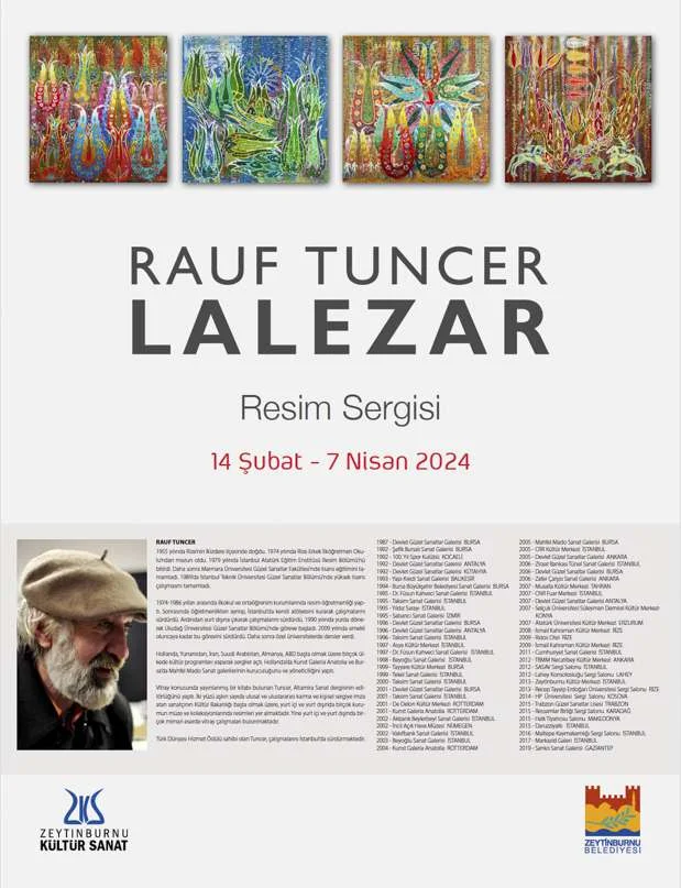 RAUF TUNCER `LALEZAR` SERGİSİ ZEYTİNBURNU KÜLTÜR SANAT’TA AÇILIYOR 13 Şub 2024 Görsel Galeri ❮ ❯ 1 / 3 Son Galeriler 🔍 MEZUNİYET SERGİSİ VE ŞÖLENİ, 14 HAZİRAN CUMARTESİ GÜNÜ ZEYTİNBURNU KÜLTÜR SANAT’TA GERÇEKLEŞTİ! 14.06.2025 🔍 MEZUNİYET SERGİSİ VE ŞÖLENİ, 14 HAZİRAN CUMARTESİ GÜNÜ ZEYTİNBURNU KÜLTÜR SANAT’TA! 12.06.2025 🔍 KAZLIÇEŞME SANAT KONUŞMALARINDA SEZONUN SON KONUĞU NAMIK SİNAN TURAN OLDU! 10.06.2025 🔍 BAŞKA SORULAR SÖYLEŞİ PROGRAMINDA SEZONUN SON KONUĞU PROF. DR. GÜLÇİN YAHYA KAÇAR OLDU! 02.06.2025 🔍 100 YÜZE İMZA VE SÖYLEŞİ PROGRAMINDA SEZONUN SON KONUĞU SADIK YALSIZUÇANLAR OLDU! 30.05.2025 🔍 ZKS 26 MAYIS-1 HAZİRAN HAFTALIK ETKİNLİK TAKVİMİ 26.05.2025 🔍 ZEYTİNBURNU KİTAPÇISI BULUŞMALARI’NDA SEZONUN SON KONUĞU PROF. DR. MEHMET SAMSAKÇI OLDU! 24.05.2025 🔍 NABİ AVCI’NIN KONUK OLDUĞU PEYAM-I GARB’TA SEZONUN SON PROGRAMI GERÇEKLEŞTİ! 23.05.2025