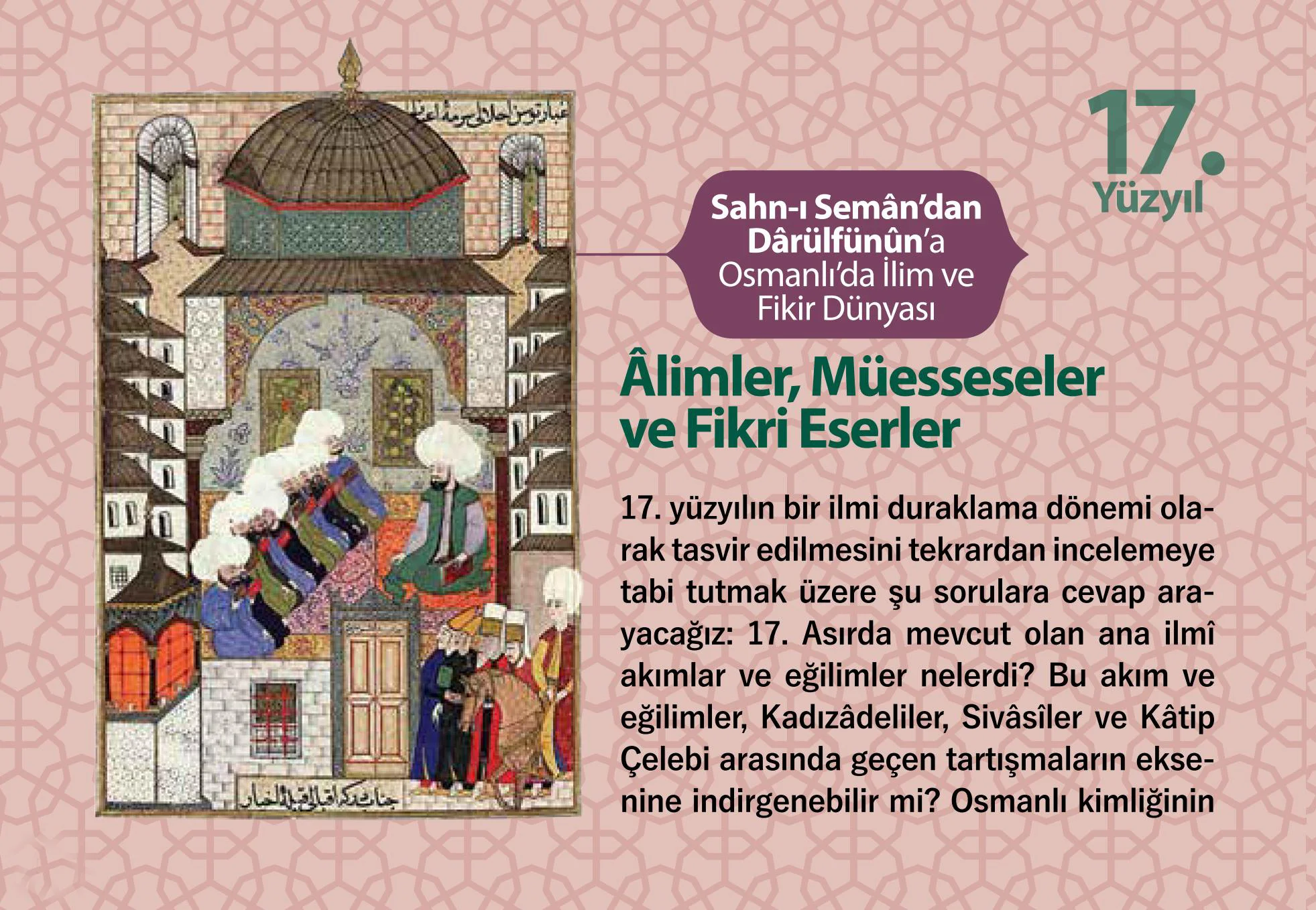 Zeytinburnu Belediyesi ve İstanbul Üniversitesi İlahiyat Fakültesi iş birliği ile gerçekleştirilecek `Sahn-ı Semân’dan Dârülfünûn’a Osmanlı’da İlim ve Fikir Dünyası` sempozyumuna, Zeytinburnu Kültür ve Sanat Merkezi ev sahipliği yapacak. 22 ve 23 Aralık tarihlerindeki sempozyumda, 17. yy Osmanlı’sında `Alimler, Müsseseler ve Fikrî Eserler` konuşulacak.
