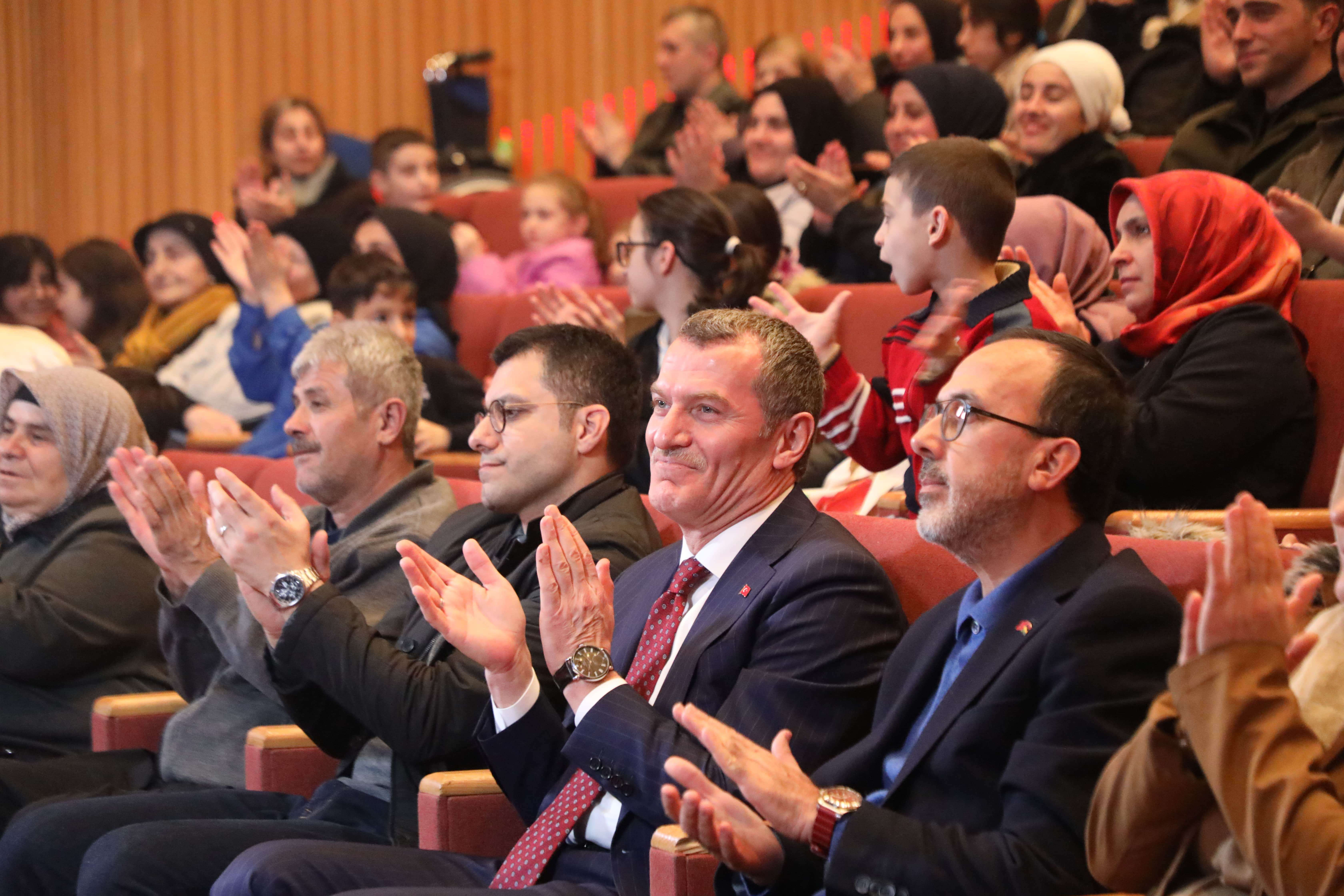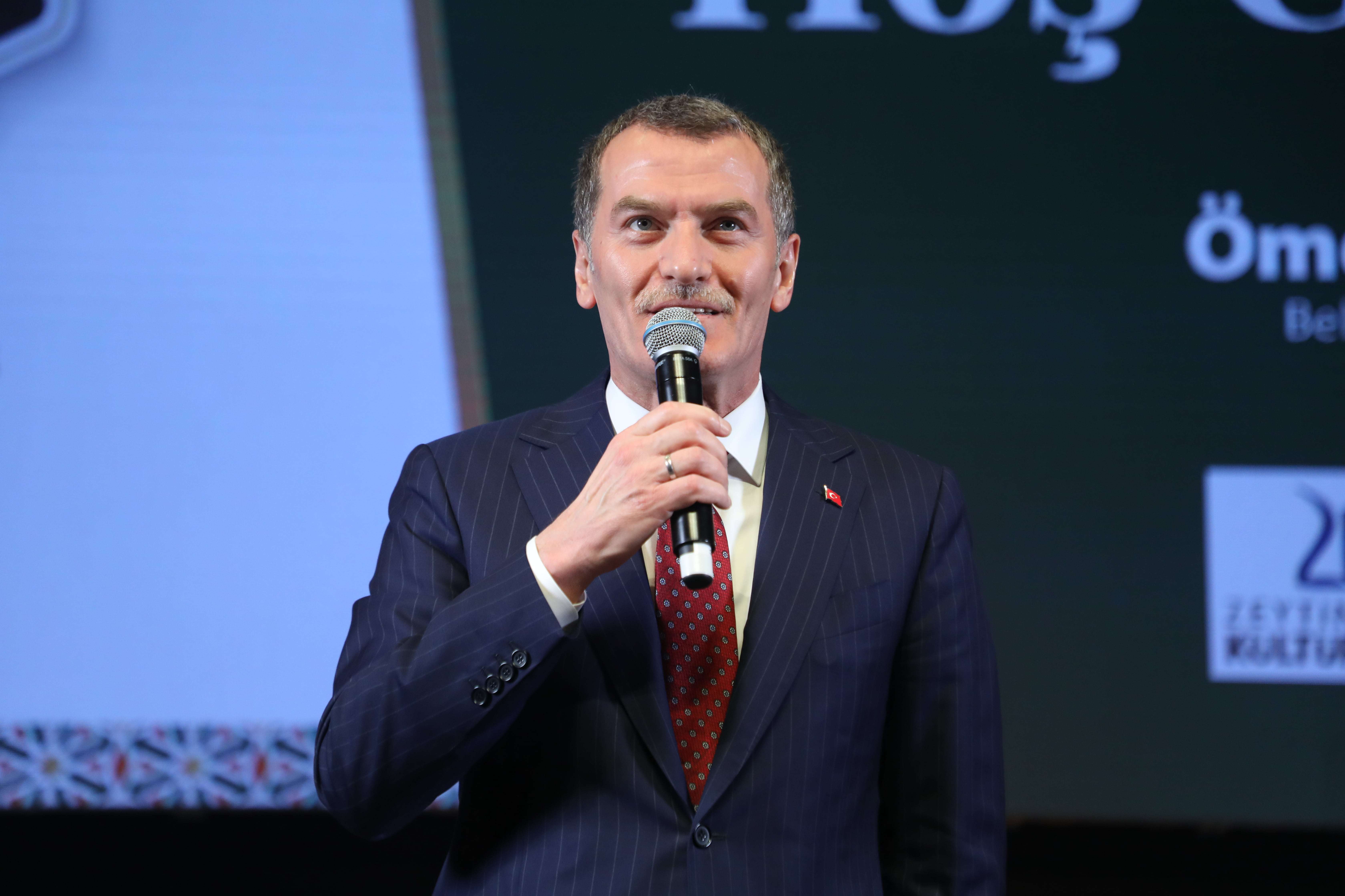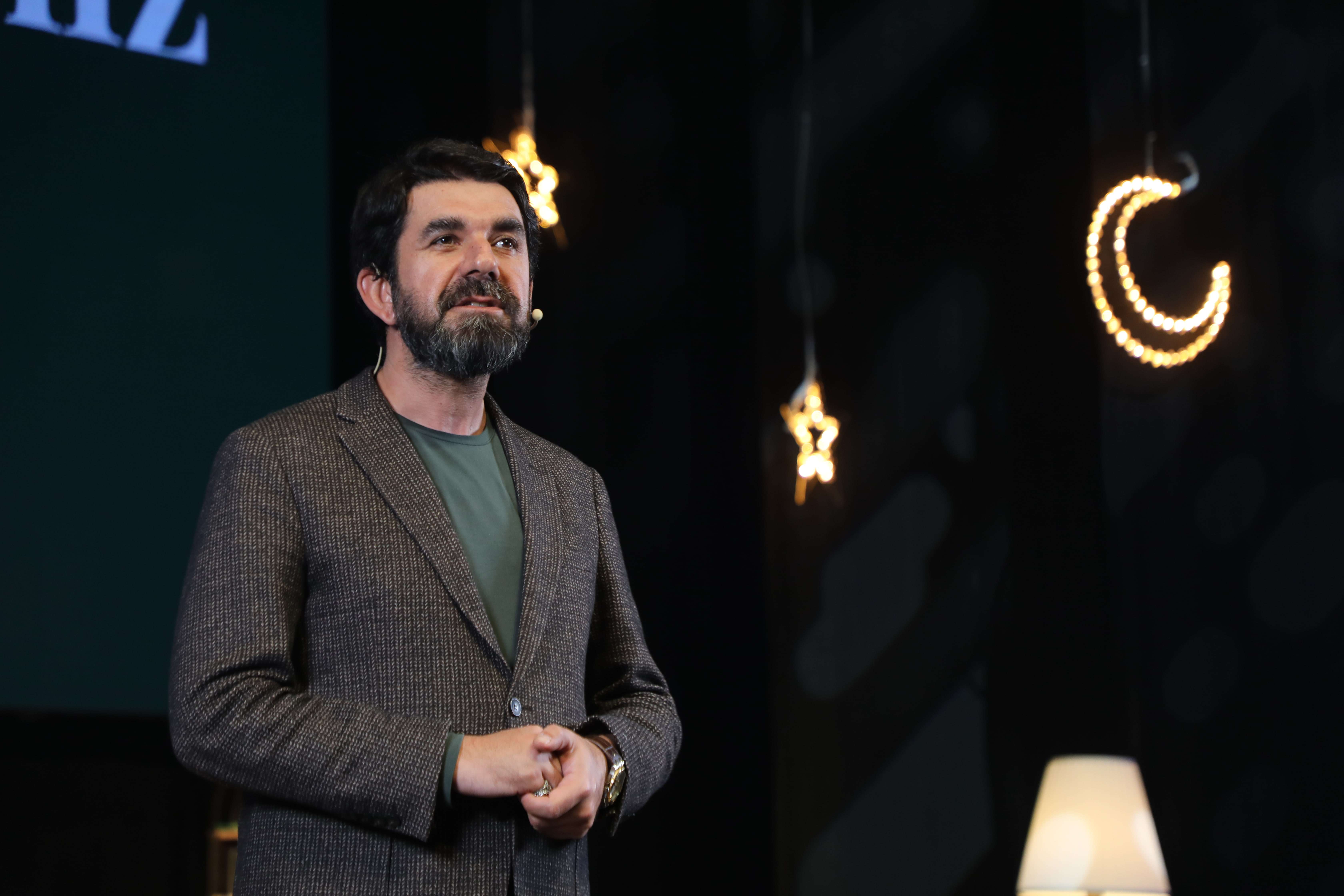 Serdar Tuncer’in açılış konuşmasından sonra sahneye davet ettiği Zeytinburnu Belediye Başkanı Sayın Ömer Arısoy, izleyicilere kısa bir selam konuşması yaptı. Ardından sahneye bu kez gecenin konuğu Mustafa Karataş çıktı. Karataş, konuşmasının başında Gazze’ye ve Gazze’de yaşananlara karşı Müslümanların verdiği tepkiler üzerine şunları söyledi: “Biz bir defa Allah-ü Teala’ya hakiki manada kul olmalıyız ki diğer Müslümanların derdini dertlenecek, taşıyacak ve çözecek bir vasfa erişelim. Kendisi muhtaç iken nerede kaldı gayriye himmet ede. Biz hepimiz zaten nakısız, eksiğiz. Kendi içimizde parçalanmışız. Biz Gazze’ye bahane buluyoruz. Orada diyoruz El-Fetih var, Hamas var, niye bölünmüşler, falan… Biz kaç parçayız? Biz ne kadar Müslümanız? Oradaki çocukların, kadınların hiçbirinin şikayeti oldu mu bugüne kadar yüz altmış gün vesaire geçti? Ey Hamas, başımıza ne işler açtın, nereden çıkardın bu direnmeyi, savaşı, diye bir Gazzeli kadının, çocuğun bir feryadını hiç duyduk mu? O kadar açlığa şahadete, işkenceye rağmen. Bombalara rağmen. Hiçbiri şikayet etmedi. Hepsi Allahuekber dedi.”