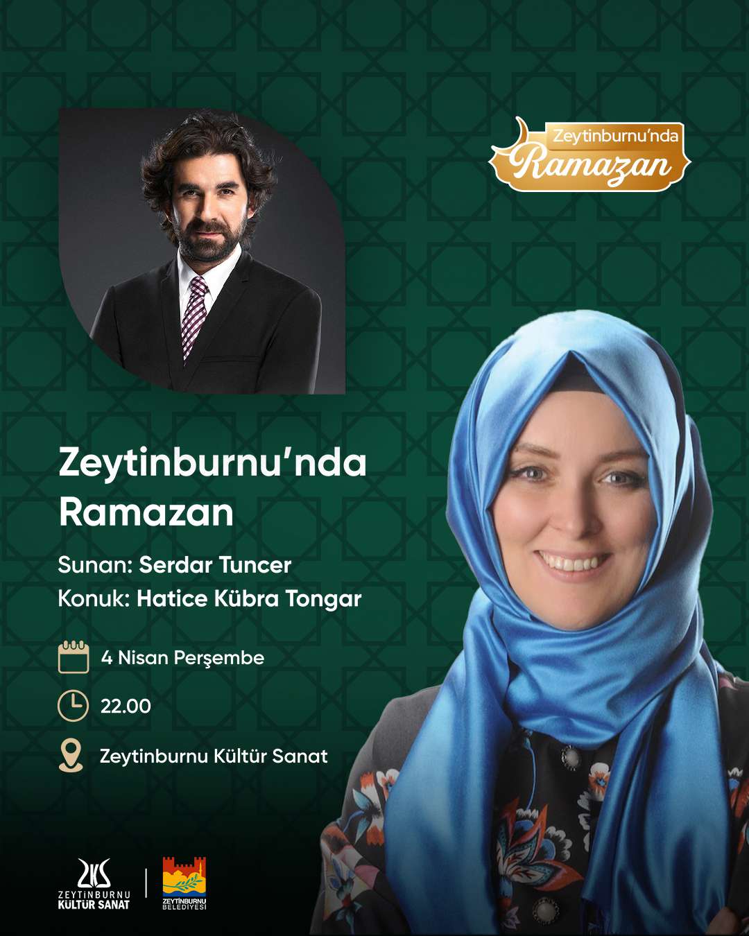 Zeytinburnu’nda Ramazan programlarında her hafta birbirinden kıymetli konuklar Zeytinburnu’nda ramazana dair konuşuyor. Serdar Tuncer’in eşsiz sunumuyla gerçekleşecek programın bu haftaki ilk konuğu Hatice Kübra Tongar. Serdar Tuncer, Hatice Kübra Tongar’la ramazan üzerine bir sohbet gerçekleştirecek.