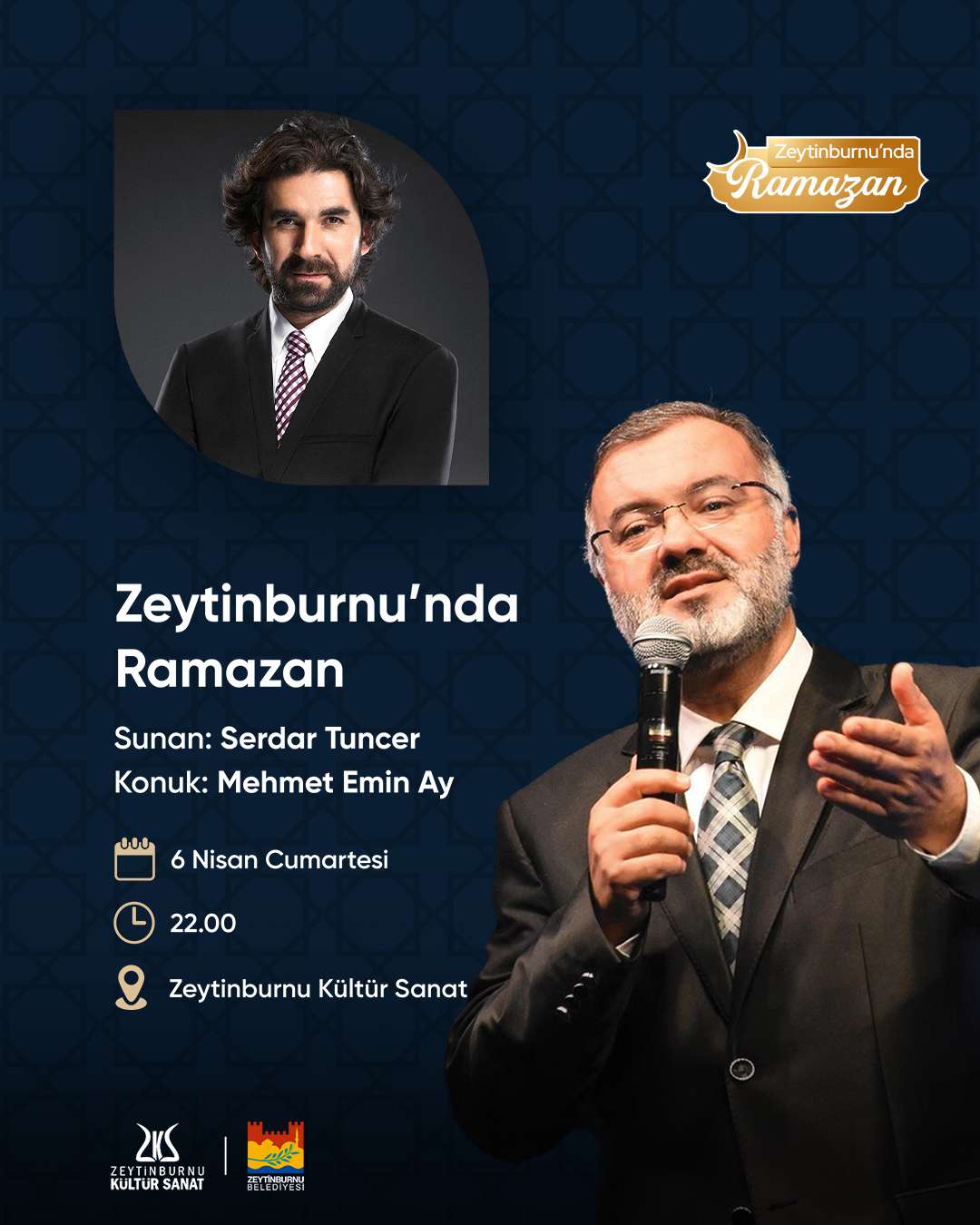 Serdar Tuncer’le Zeytinburnu’nda Ramazan programında her hafta birbirinden kıymetli konuklar Zeytinburnu’nda ramazana dair konuşuyor. Serdar Tuncer’in eşsiz sunumuyla gerçekleşecek programın bu haftaki konuğu Mehmet Emin Ay. Tuncer, Mehmet Emin Ay ile ramazan üzerine bir sohbet gerçekleştirecek.