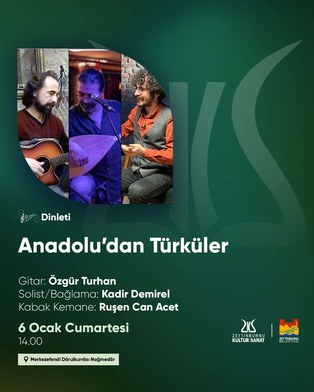 Zeytinburnu'nda, geleneksel Türk müziği icracıları ve sevenlerinin düzenli olarak bir araya geldikleri Nağmedar, bu hafta da özel bir dinleti ile müzikseverleri davet ediyor. “Anadolu’dan Türküler” konserini icra edecek sanatçıların isimleri ise şu şekilde: Gitarda Özgür Turhan, bağlamada solist Kadir Demirel, kabak kemanede Ruşen Can Acet.