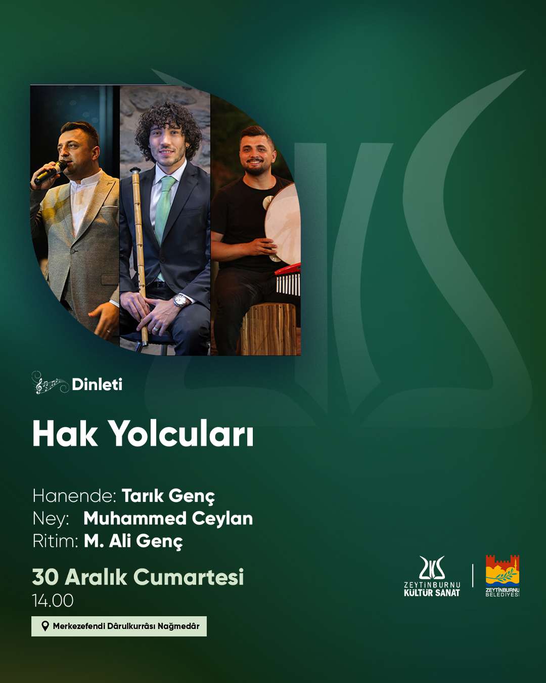 Zeytinburnu'nda, geleneksel Türk müziği icracıları ve sevenlerinin düzenli olarak bir araya geldikleri Nağmedar, bu hafta da özel bir dinleti ile müzikseverleri davet ediyor. “Hak Yolcusu” konserini icra edecek sanatçıların isimleri ise şu şekilde: Hanende Tarık Genç, Neyzen Muhammet Ceylan ve ritimde M. Ali Genç.