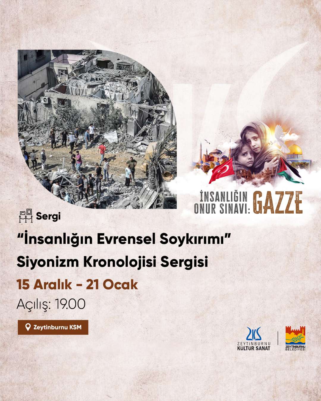 İnsanlık, İsrail’in Filistin topraklarında 75 yıl önce başlayan işgal girişiminden bugüne, şu anda bütün dünyanın gözü önünde çocuk katletmesinin meşru sayıldığı yere nasıl getirildi? “İnsanlığın Evrensel Soykırımı“ sergi projesi, kronolojik olarak insanlığın günümüzde geldiği bu noktayı ve yok oluşunu adım adım bilgilerle, fotoğraflarla ve belgelerle ortaya koyma çalışmasıdır. Sergi, bugün sadece Gazze’deki masum sivillere fiilen soykırım yapan İsrail’in aslında bütün uluslararası örgütlere, demokrasinin beşiği kabul edilen ‘İnsan Hakları Evrensel Beyannamesi’ne imza atan bütün ülke yöneticilerine nasıl bir ‘zihinkırım’ uyguladığının da altını çiziyor. 2. Dünya Savaşı’ndan sonra imzalanan 19. Uluslararası Savaş Hukuku Sözleşmesi’nden Uluslararası Savaş Mahkemesi’ne, insanlığın ulaşabildiği bütün bu değerlerin bugün İsrail’in önüne geçilemeyen katliamları ve soykırımı nedeniyle insanlıkla beraber yok oluşunun tarihî günlerine şahitlik ediyoruz. Sergi, insanlığın birikiminden, değerlerinden uzaklaşmış, İsrail’in Gazze’ye yönelik saldırılarıyla birlikte tutsak olduğunun gün yüzüne çıkan ülke yöneticilerine ışık tutarken, ayrıca bütün dünya milletlerinin harekete geçen maşeri vicdanı ve sivil başkaldırışını da gözler önüne sererek, yeni bir dünya mümkün ümidine de odaklanıyor.
