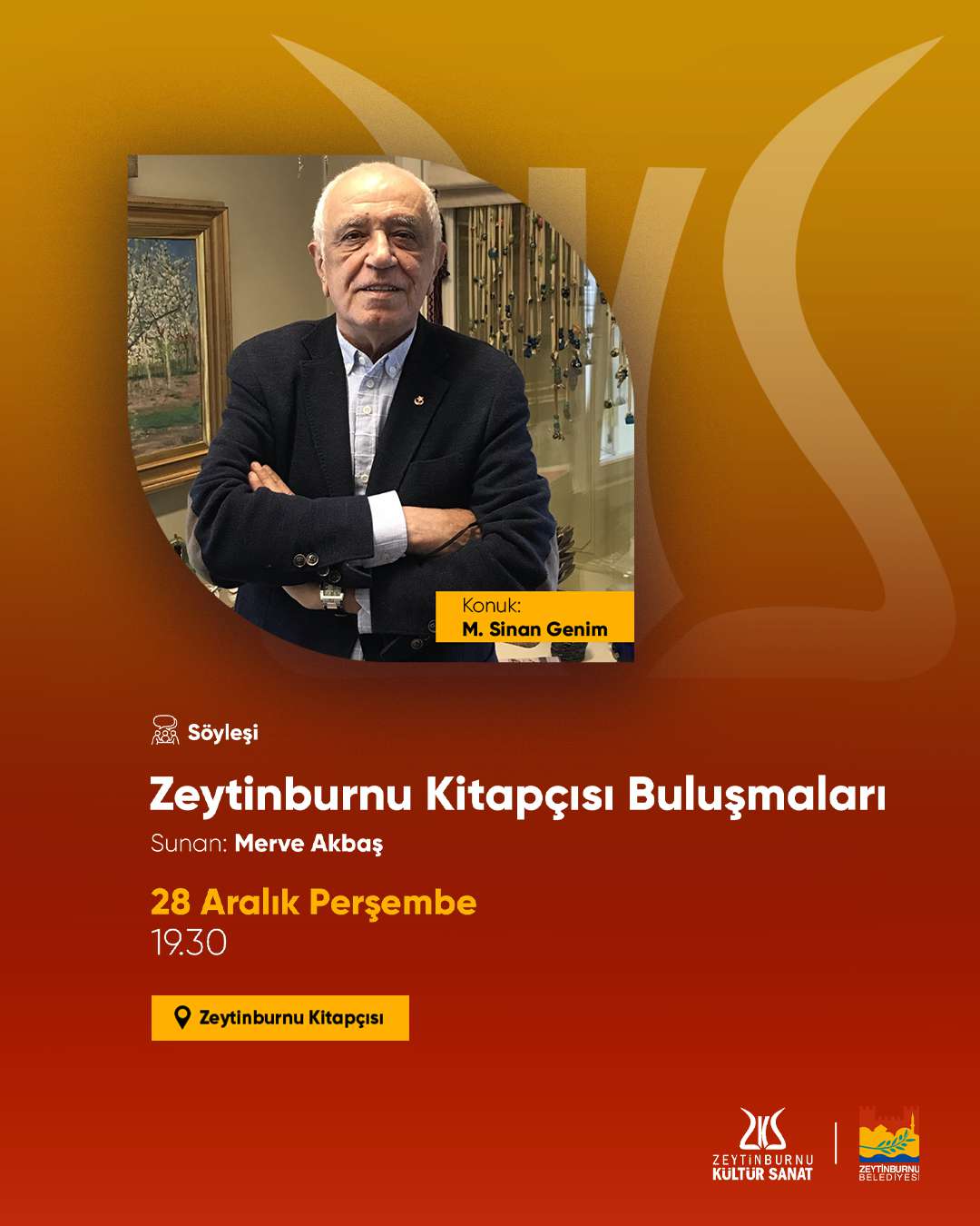 Zeytinburnu Kültür Sanat, sizleri Türkiye’nin en önemli şair ve yazarlarıyla buluşturmaya devam ediyor. “100 Yüze İmza ve Söyleşi” programında Aykut Ertuğrul’un aralık ayındaki konuğu Prof. Dr. Ahmet Sarı olacak. Yezbül Dağında Durulmuş Bir Geyik-Sezai Karakoç Yazıları isimli yeni kitabından hareketle, Çiğdem’le eserleri ve yazı hayatı üzerine yapılacak bu sohbete davetlisiniz.