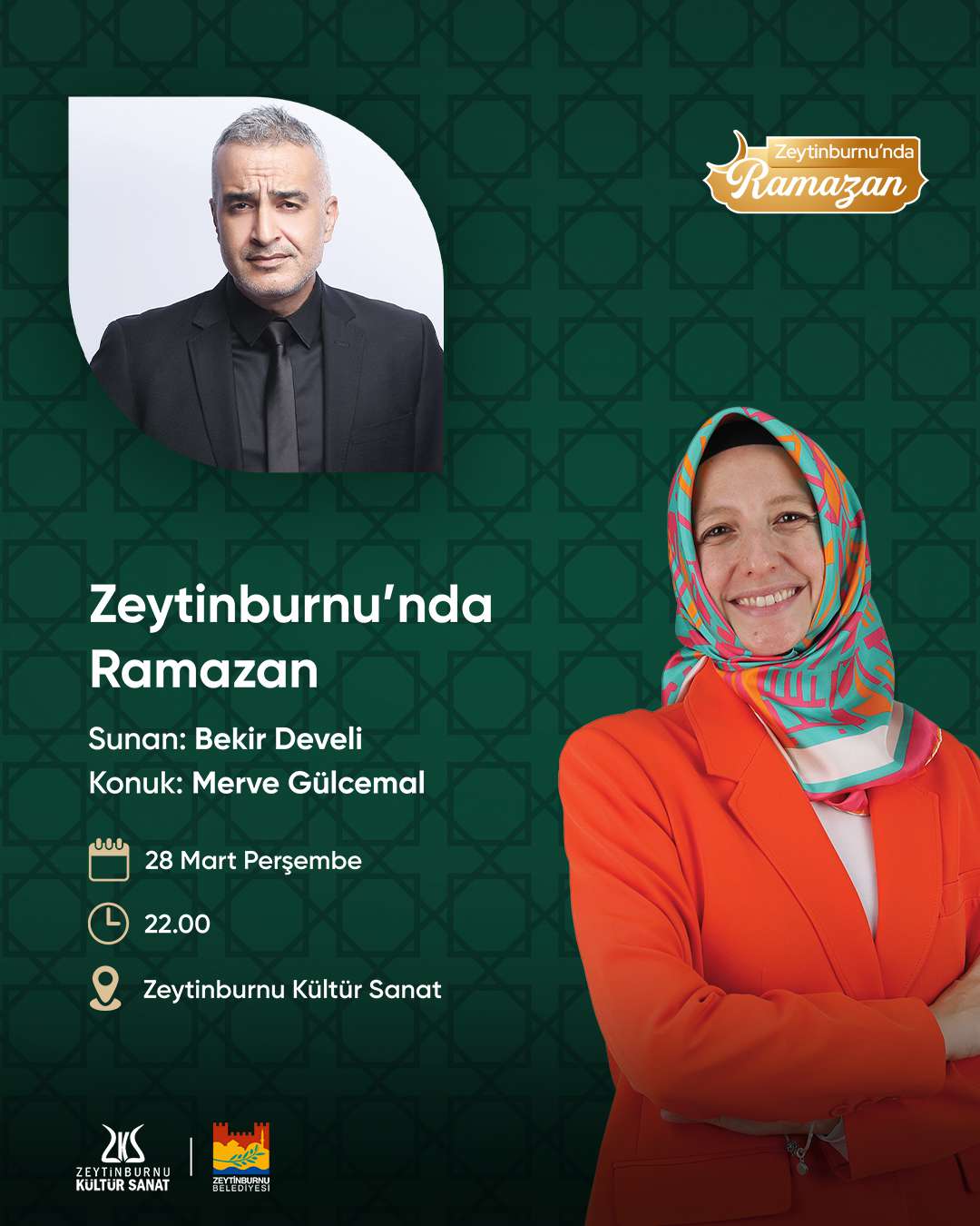 Zeytinburnu’nda Ramazan programlarında her hafta birbirinden kıymetli konuklar Zeytinburnu’nda ramazana dair konuşuyor. Bekir Develi’nin eşsiz sunumuyla gerçekleşecek programın bu haftaki ilk konuğu Merve Gülcemal. Bekir Develi, Merve Gülcemal’le ramazan üzerine bir sohbet gerçekleştirecek.