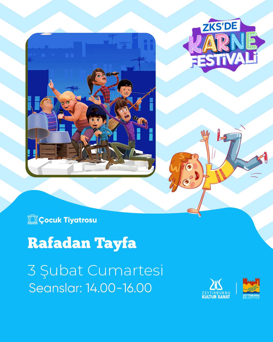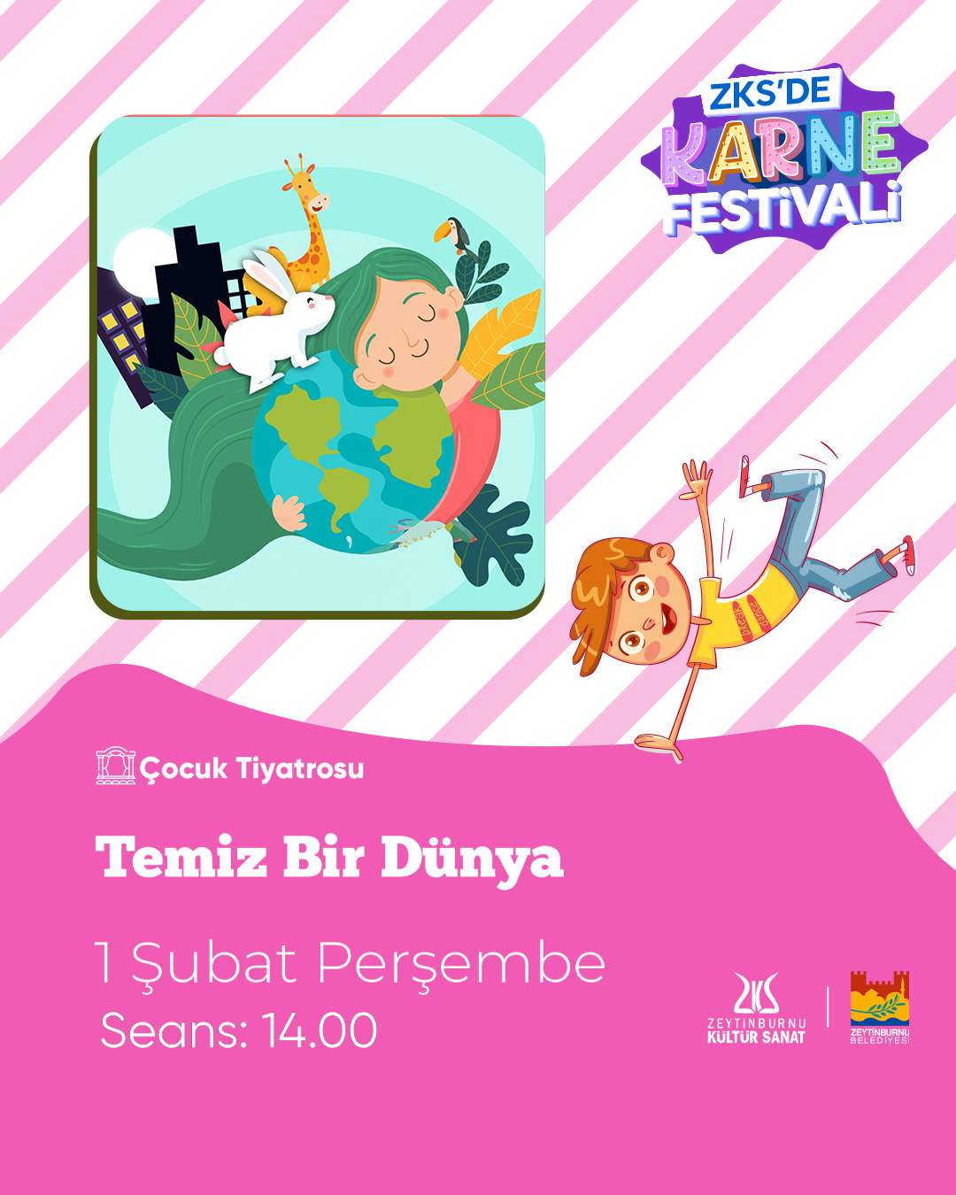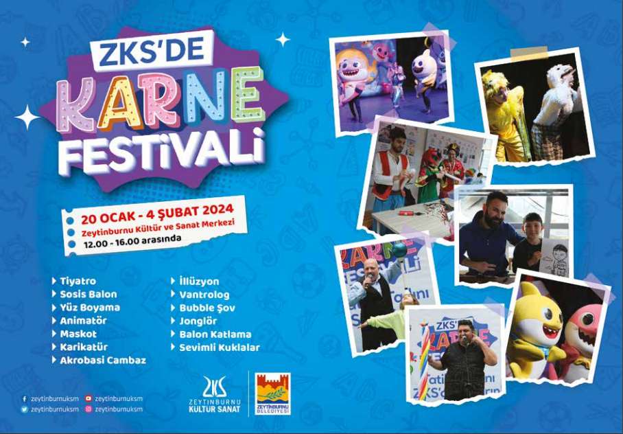 Zeytinburnu Kültür Sanat çocuklarımızın karne sevincine ortak oluyor! 20 Ocak’ta başlayacak olan ara tatilde tüm çocuklarımızı özel etkinlikler hazırladığımız Karne Festivali’ne davet ediyoruz. Bu festivalde sinema ve tiyatro gösterimleri ile birlikte sosis balon, yüz boyama, maskot, karikatür etkinlikleri ile birlikte akrobasi cambaz, illüzyon, animatör, balon katlama, vantrolog, bubble şov, sevimli kuklalar gösterileri de çocuklarımız bekliyor.