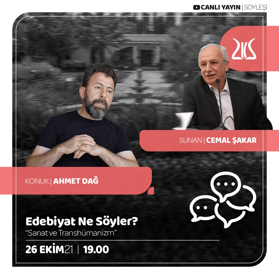 Cemal Şakar’ın sunduğu “Edebiyat Ne Söyler?” söyleşi serisinin 26 Ekim’deki konuğu Doç. Dr. Ahmet Dağ’dı. Hümanizm, posthümanizm ve transhümanizm kavramları üzerinden bir söyleşi gerçekleşti. Kavramların günümüzdeki sanatsal ve teknik yönden algılanış biçimlerine değinildi.