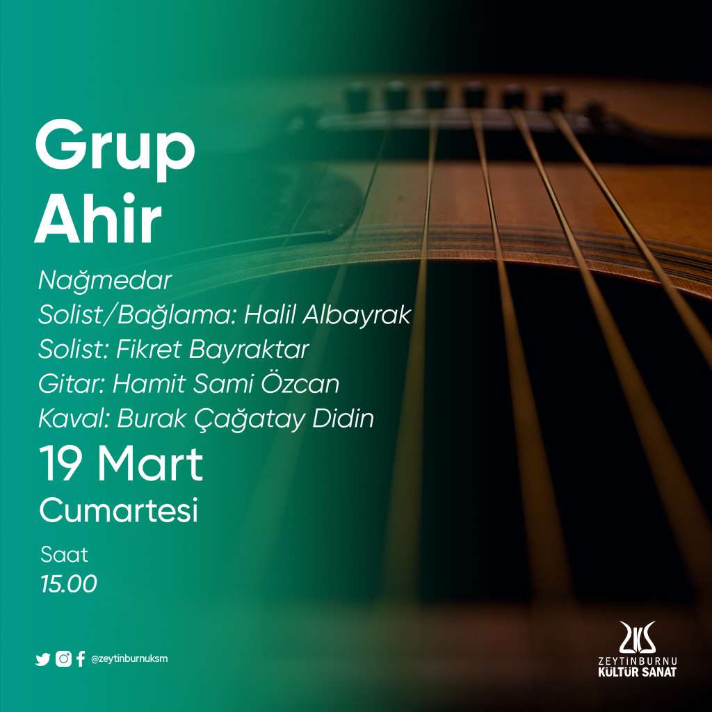 Zeytinburnu'nda, geleneksel Türk müziği icracıları ve sevenlerinin düzenli olarak bir araya geldikleri Nağmedar, bu hafta da özel bir dinleti ile müzikseverleri davet ediyor. “Grup Ahir” dinletisini icra edecek sanatçıların isimleri ise şu şekilde: solist Halil Albayrak- Fikret BAyraktar, gitarHamit Sami Özcan, kaval Burak Çağatay Didin.