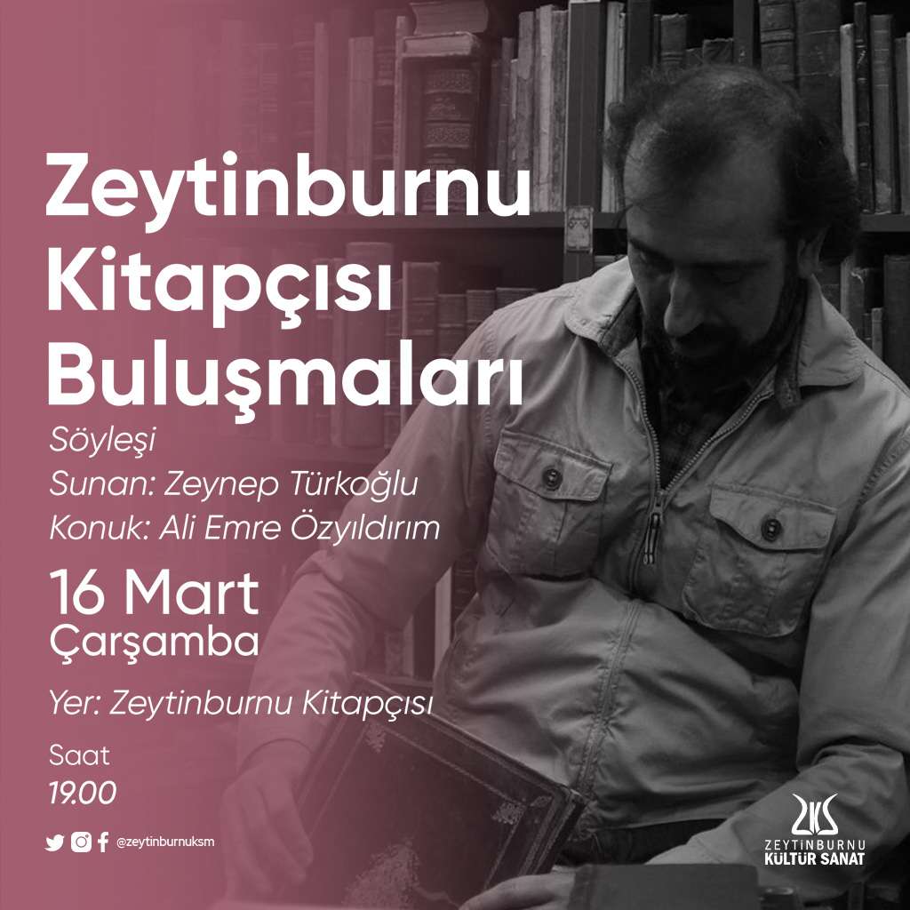 Zeytinburnu Kitapçısında Zeynep Türkoğlu, her ay birbirinden kıymetli konukları ağırlamaya devam ediyor. “Zeytinburnu Kitapçısı Buluşmaları”nın mart ayı konuğu yazar Ali Emre Özyıldırım. Türkoğlu, “Cahit Sıtkı Tarancı’dan Feridun Fazıl Tülbentçi’ye Mektuplar” kitabı çerçevesinde bir sohbet gerçekleştirecek..