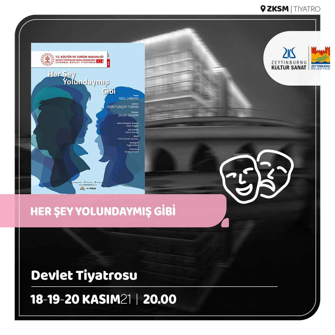 Amerikalı yazar Neil LaBute’un modern zaman ikili ilişkileri üzerine çarpıcı yaklaşımlarla kaleme aldığı üç kısa oyunu Ölüler Diyarı, Bir Mutluluk Anı ve Karmakarışık bir araya gelerek Her Şey Yolundaymış Gibi başlığıyla izleyiciyle buluşuyor. Karmaşık insan ruhunun ikili ilişkilerdeki akılalmaz yansımalarını gözler önüne seren Her Şey Yolundaymış Gibi, çiftlerin ilişkilerinde sorumluluk almalarından kaçmalarını ve nasıl ölümcül bir hesaplaşmaya taşındıklarını anlatıyor. İzlediklerinizin başınıza gelmediğine bir yandan sevinebilir bir yandan benim de başıma gelmesi muhtemel diye düşünebilirsiniz.