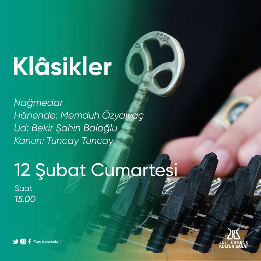 Zeytinburnu'nda, geleneksel Türk müziği icracıları ve sevenlerinin düzenli olarak bir araya geldikleri Nağmedar, bu hafta da özel bir dinleti ile müzikseverleri davet ediyor. “Klâsikler” konserini icra edecek sanatçıların isimleri ise şu şekilde: hânende Memduh Özyalvaç, udî Bekir Şahin Baloğlu, kanunî Tuncay Tuncay.