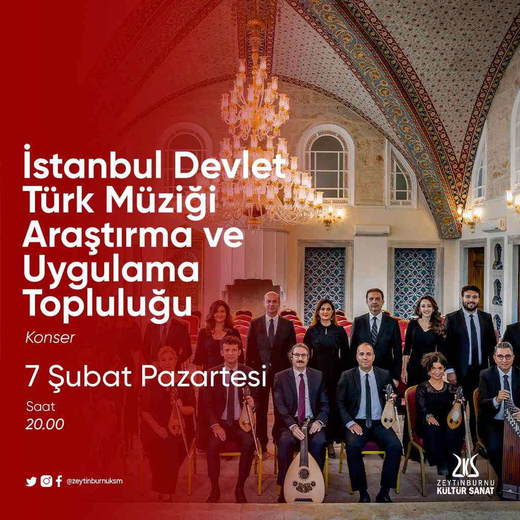 Türk Müziği'nin târihi seyri içerisinde gelenekten gelen icrâ tavrına bağlı kalarak etkinliklerini devam ettiren İstanbul Devlet Türk Müziği Araştırma ve Uygulama Topluluğu, 20 kişilik bir sanatçı kadrosuyla 7 Şubat Pazartesi günü saat 20.00'de Zeytinburnu Kültür Sanat'a konuk oluyor.