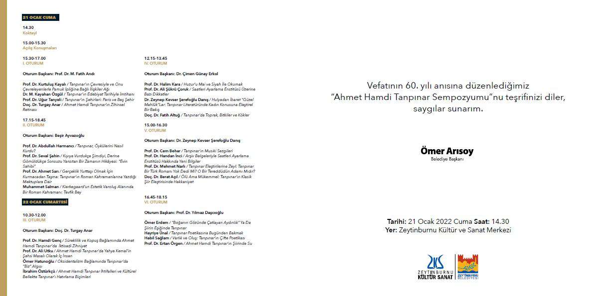 Sempozyum, 21 Ocak Cuma günü saat 14.30'da Prof. Dr. Nabi Avcı ve Zeytinburnu Belediye Başkanı Ömer Arısoy'un konuşmalarıyla açılacak. Saat 15.00’te başlayacak açılış oturumu Prof. Dr. M. Fatih Andı'nın başkanlığında gerçekleşecek. Oturum konuşmacıları Prof. Dr. Kurtuluş Kayalı, Dr. M. Kayahan Özgül, Prof. Dr. Uğur Tanyeli, Doç. Dr. Turgay Anar; Tanpınar'ın çevresiyle olan ilişkilerini, edebiyat tarihi üzerine olan bakış açısını, şehir kültürü hakkındaki fikirlerini değerlendirecekler. Sempozyumun ikinci oturumunda Beşir Ayvazoğlu araştırmacıları yönlendirmek üzere oturum başkanlığı görevini üstlenecek. Tanpınar'ın öykülerini ve romanlarını nasıl kurguladığı, kahramanlarını yerleştirdiği mekan ve zaman varoluşçuluk ile birlikte dile gelecek. Bu hususları; Prof. Dr. Abdullah Harmancı, Prof. Dr. Seval Şahin, Prof. Dr. Ahmet Sarı ve Muhammet Salman gündeme getirecekler.