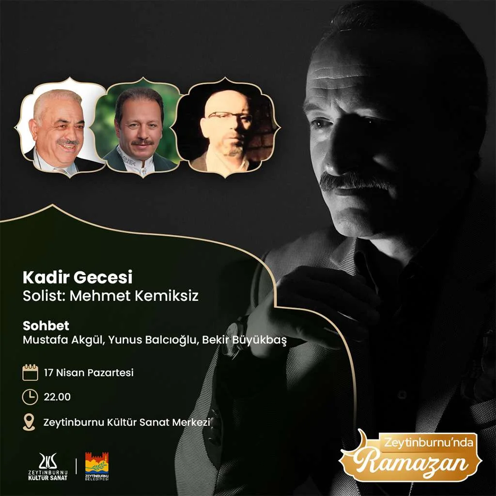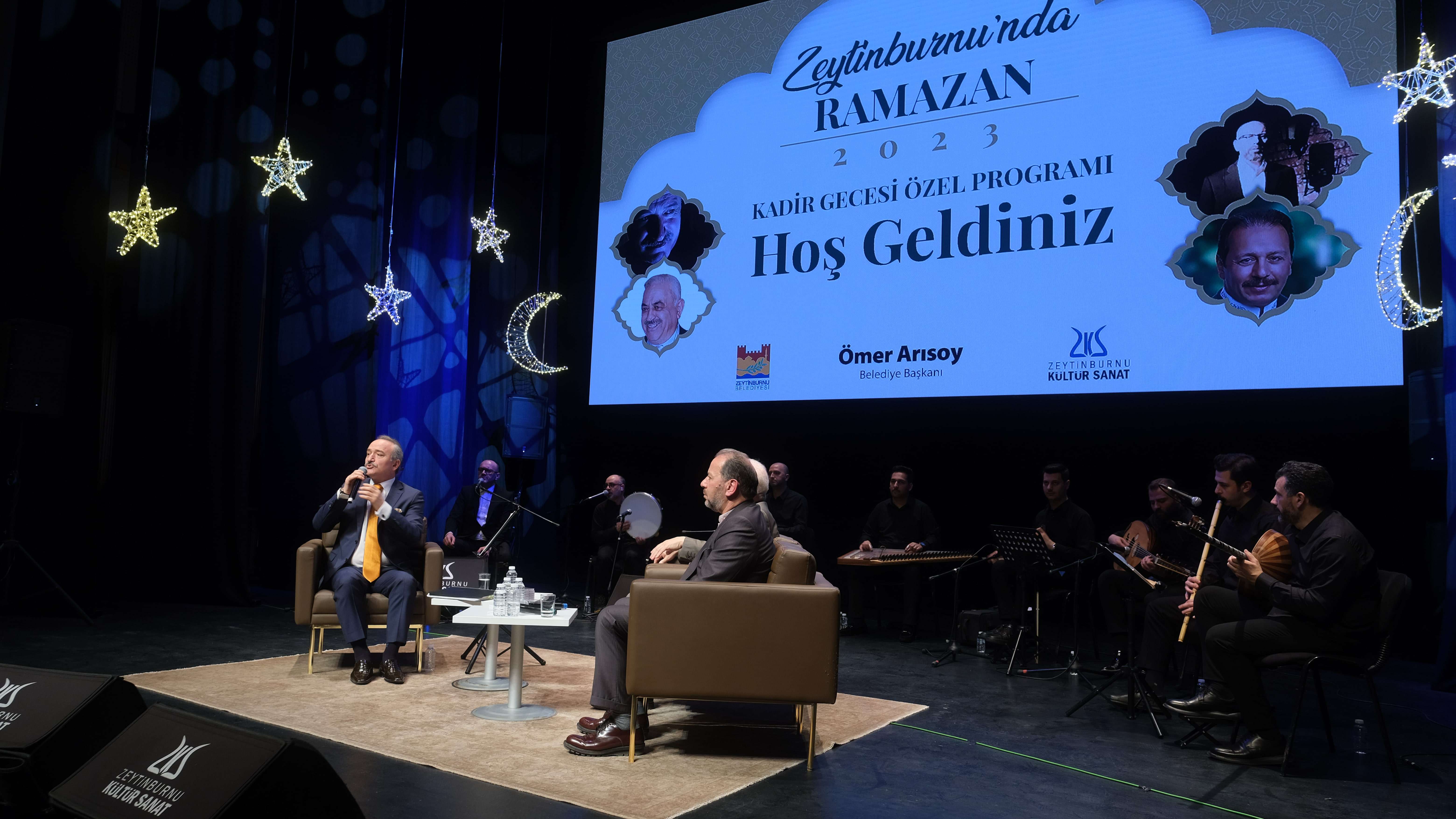 Zeytinburnu Kültür Sanat’ta Ramazan etkinlikleri Kadir Gecesi Özel programı ile devam etti. Mehmet Kemiksiz’in sunduğu bu özel programda söyleşiye Kur’an-ı Kerim tilaveti ve ilahi dinletileri eşlik etti.