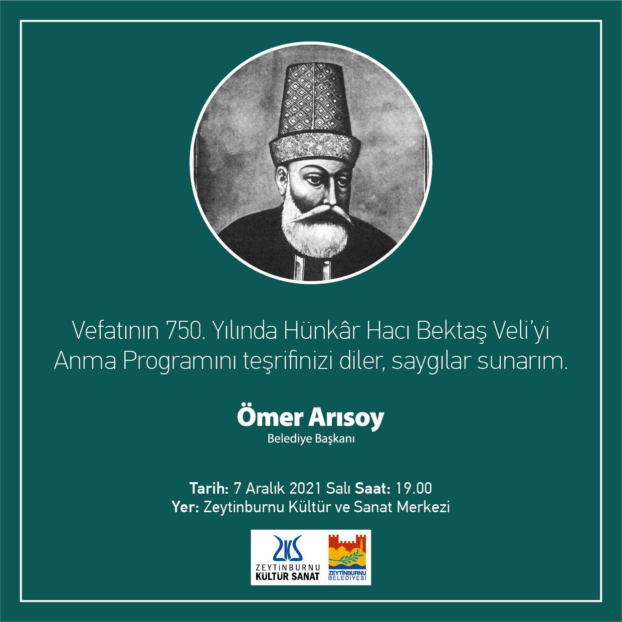 Seyyid, mutasavvıf, âlim ve İslam filozofu, Alevi-Bektâşilik’in fikir ve isim öncülerinden Hünkâr Hacı Bektaş Veli, vefatının 750. yılı dolayısıyla Zeytinburnu Kültür Sanat’ta gerçekleşecek bir programla anılıyor. Metin Tarhan’ın yöneteceği anma programına; Prof. Dr. Ali Yaman ve Prof. Dr. Armağan Coşkun konuşmacı olarak katılacak.