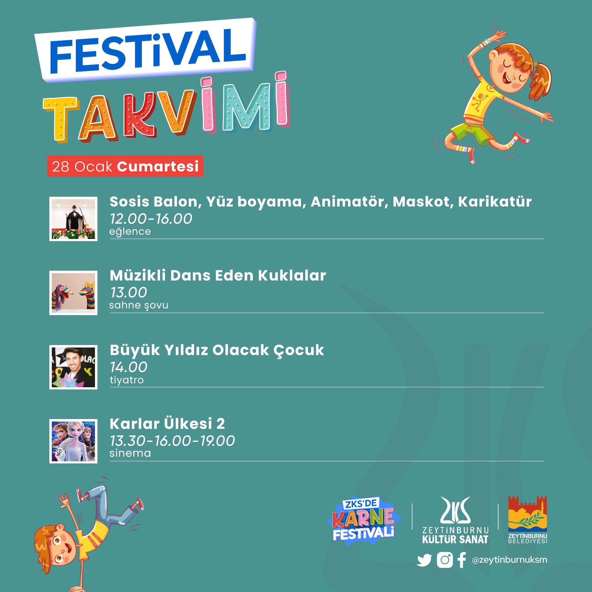 Zeytinburnu Belediyesi karnesini alan bütün öğrencileri Karne Festivali’ne davet ediyor. Birbirinden eğlenceli etkinliklerin yer aldığı Karne Festivali, 21 Ocak-5 Şubat tarihleri arasında Zeytinburnu Kültür ve Sanat Merkezinde olacak. 12 gün boyunca sürecek Karne Festivali’nde çocuklar; sosis balon, yüz boyama, animatör, maskot, karikatür, akrobasi-cambaz şovu, illüzyon, vantrolog, bubble Şov, jonglör, balon katlama, sevimli kuklalar, tiyatro ve sinema gösterimleri gibi etkinliklerle sömestr tatilinin keyfini doyasıya çıkaracaklar.