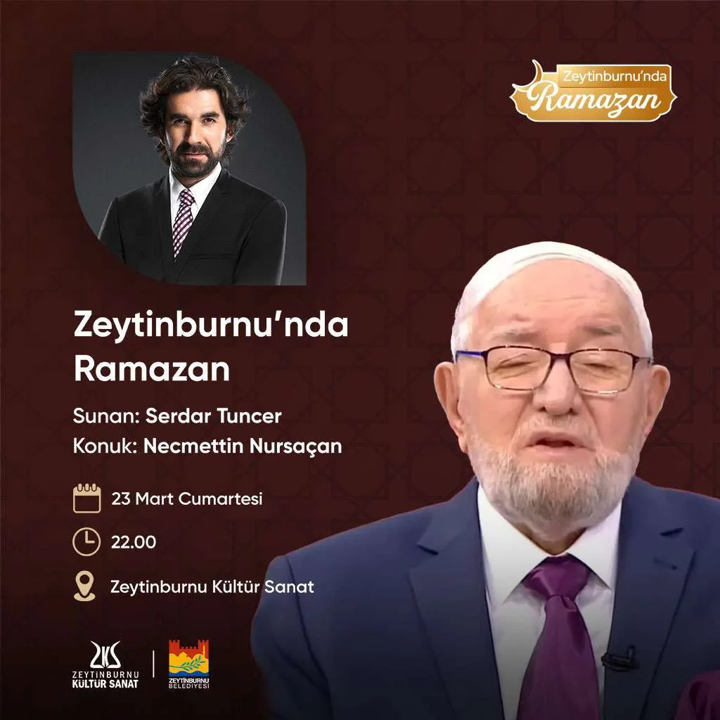 Zeytinburnu’nda Ramazan etkinlikleri, çocuk programları, söyleşi ve tasavvuf konserleri ile devam ediyor. Programının 23 Mart akşamı konuğu Necmettin Nursaçan oldu. Serdar Tuncer’in sunumuyla başlayan programda Necmettin Nursaçan ile Ramazan üzerine bir sohbet gerçekleştirildi.