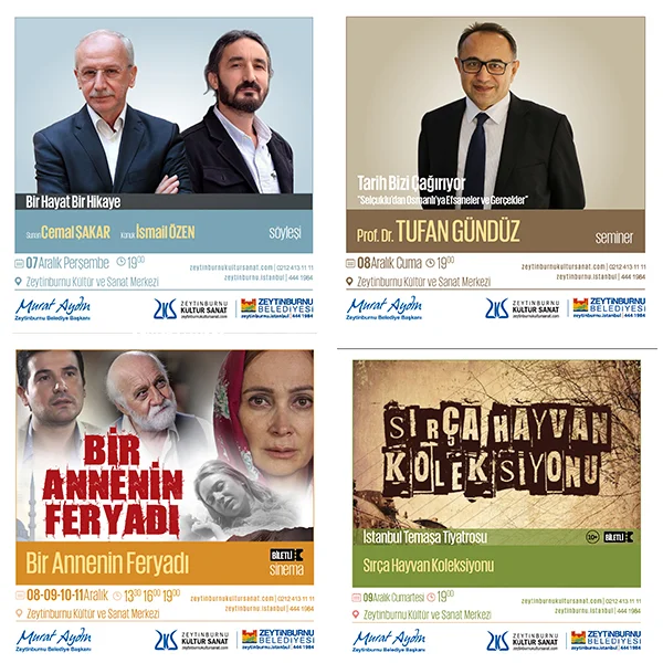 Zeytinburnu Kültür ve Sanat Merkezinde aralık ayının ilk haftası yine kültür sanat adına yoğun bir gündem var. Söyleşi ve seminerlerin yanı sıra, Atilla Gökbörü’nün yönettiği `Bir Annenin Feryadı` sinema filmi ile İstanbul Temaşa Tiyatrosu’nun hazırladığı `Sırça Hayvan Koleksiyonu` oyunu da ZKSM’de izleyicileriyle buluşacak.